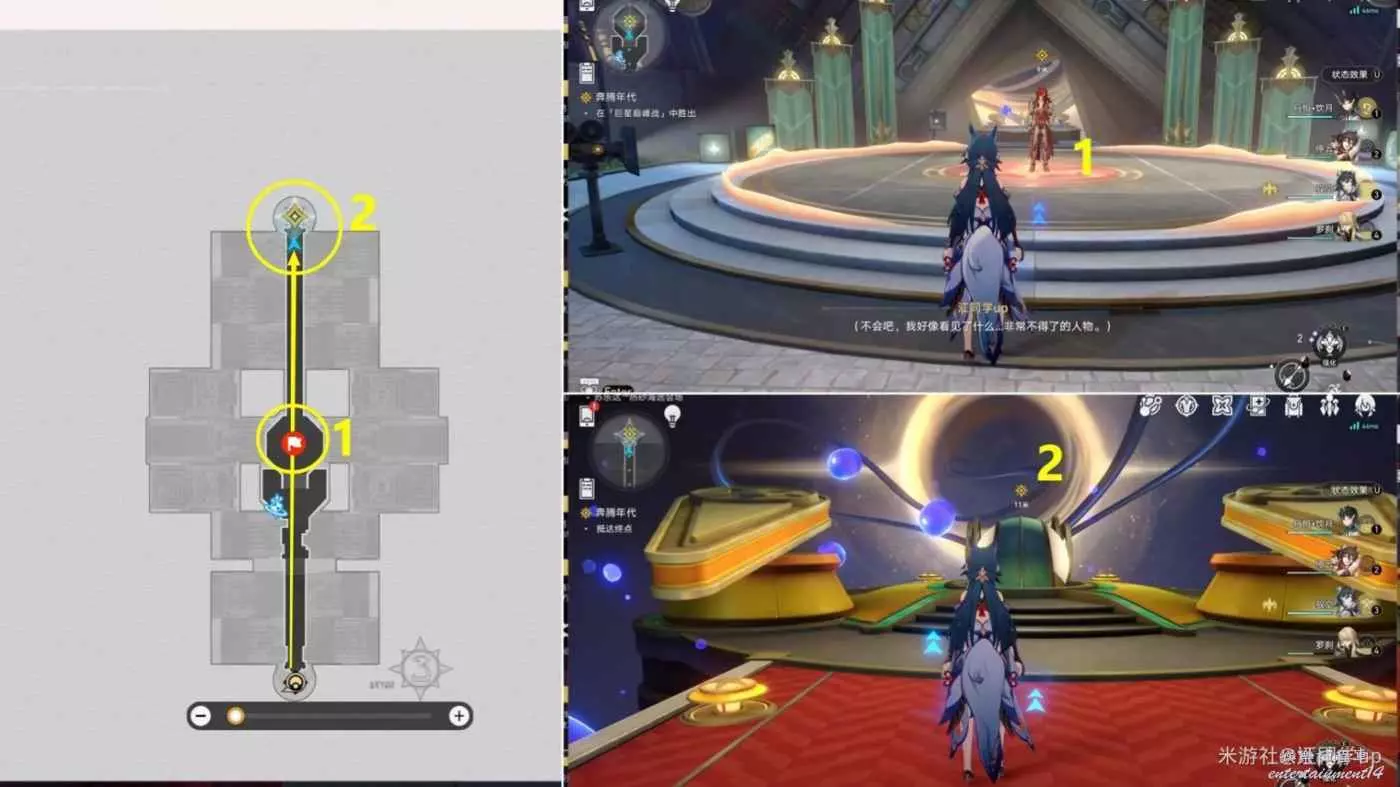 (13)上圖會傳送到下圖位置,先去1任務打完銀枝,再去2任務點傳送,這裡順便說一個2選1成就,在1任務點如果你打敗銀枝,會獲得成就《終結技是永遠的真誠》,如果你能說服銀枝,則會獲得成就《真誠是永遠的終結技》,屬於【通往群星的軌道】