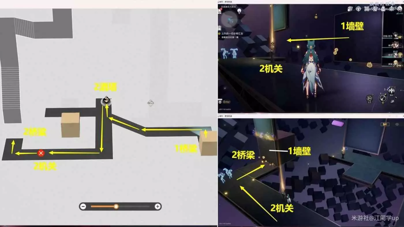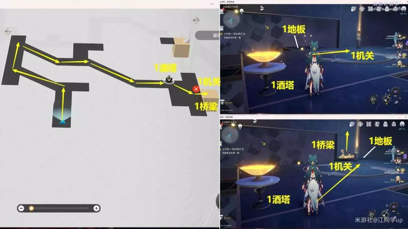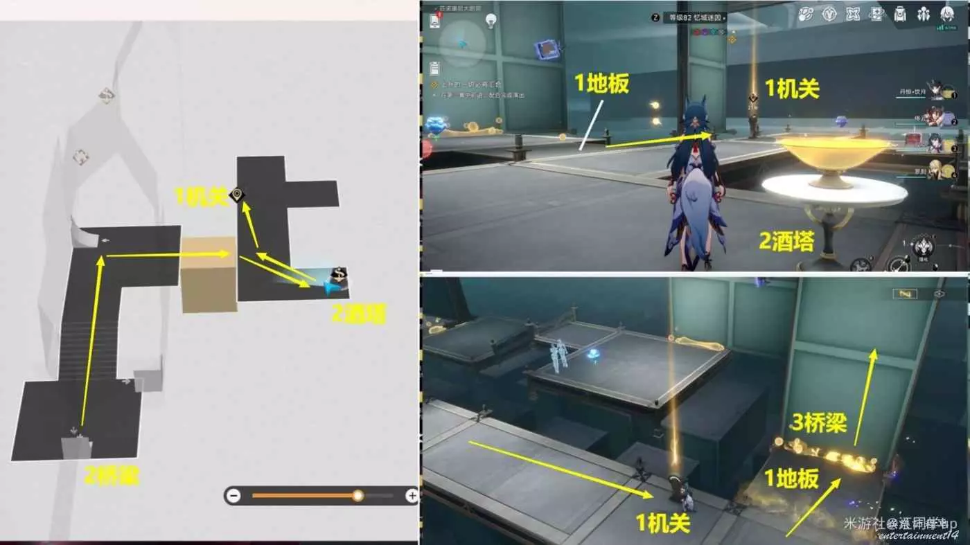(4)進入上圖第1個鏡子副本後,去【1酒塔】獲得次數,接著啟動【1機關】將【1地板】移動到右邊,然後從【1橋樑】上去