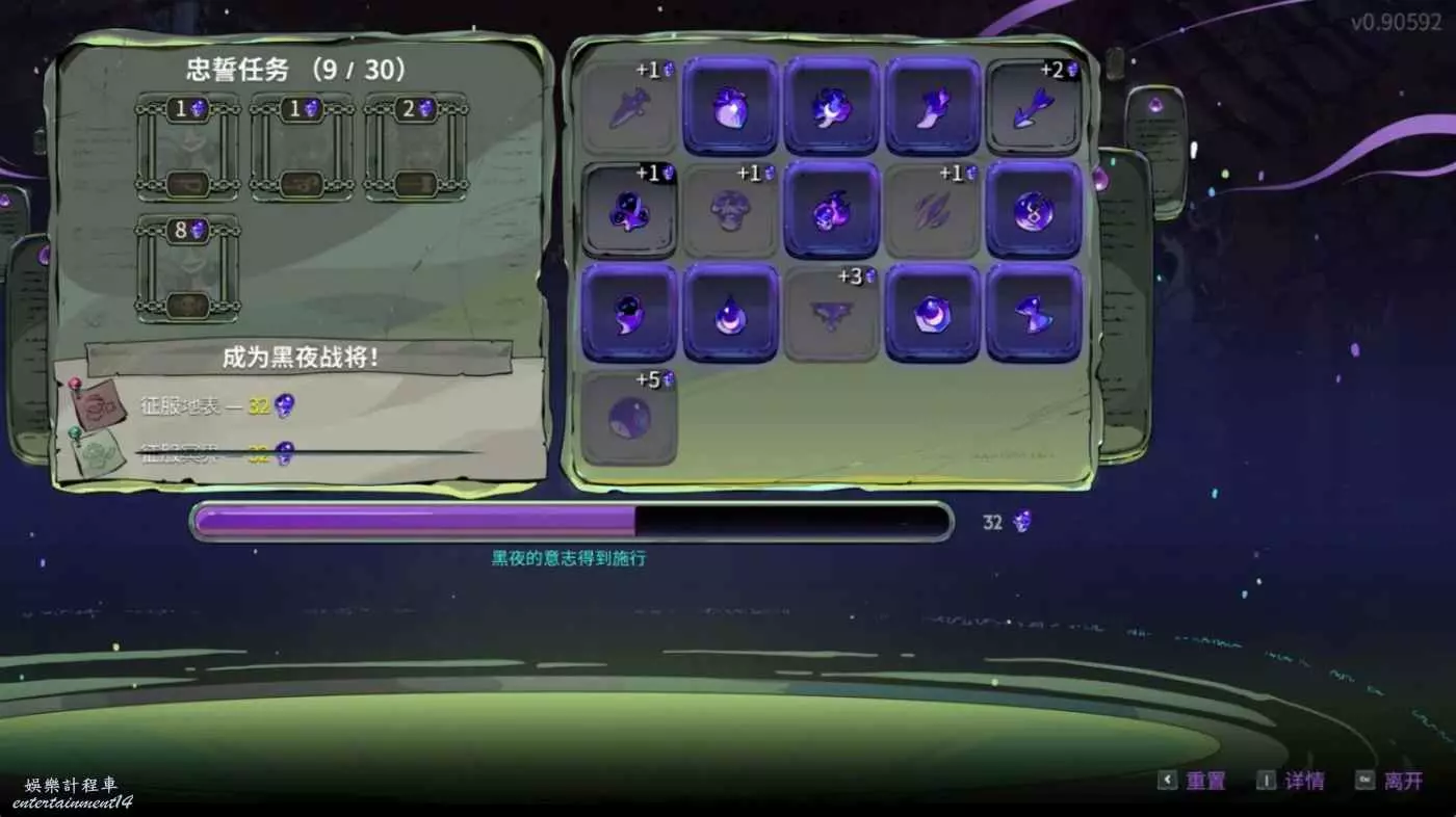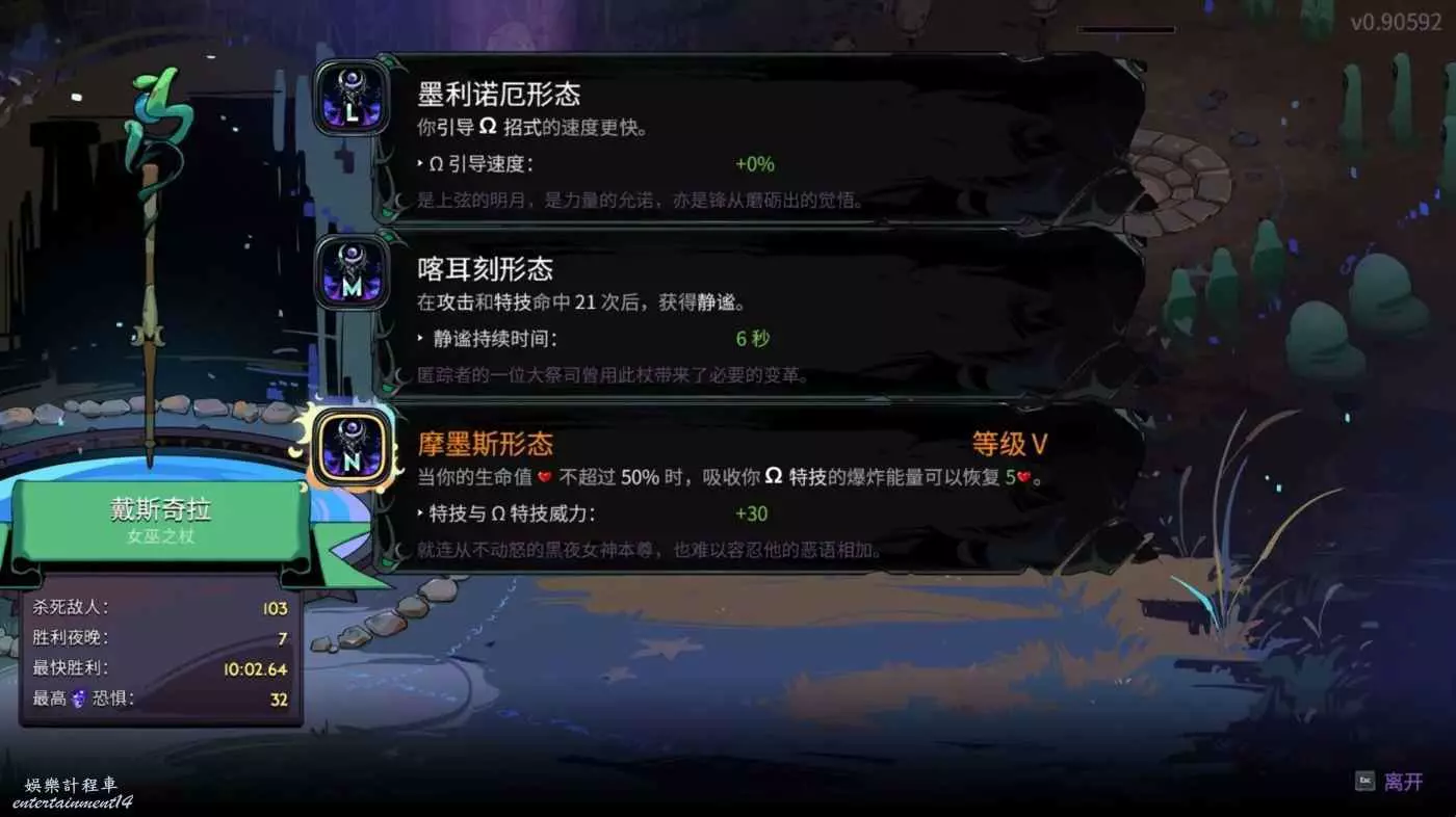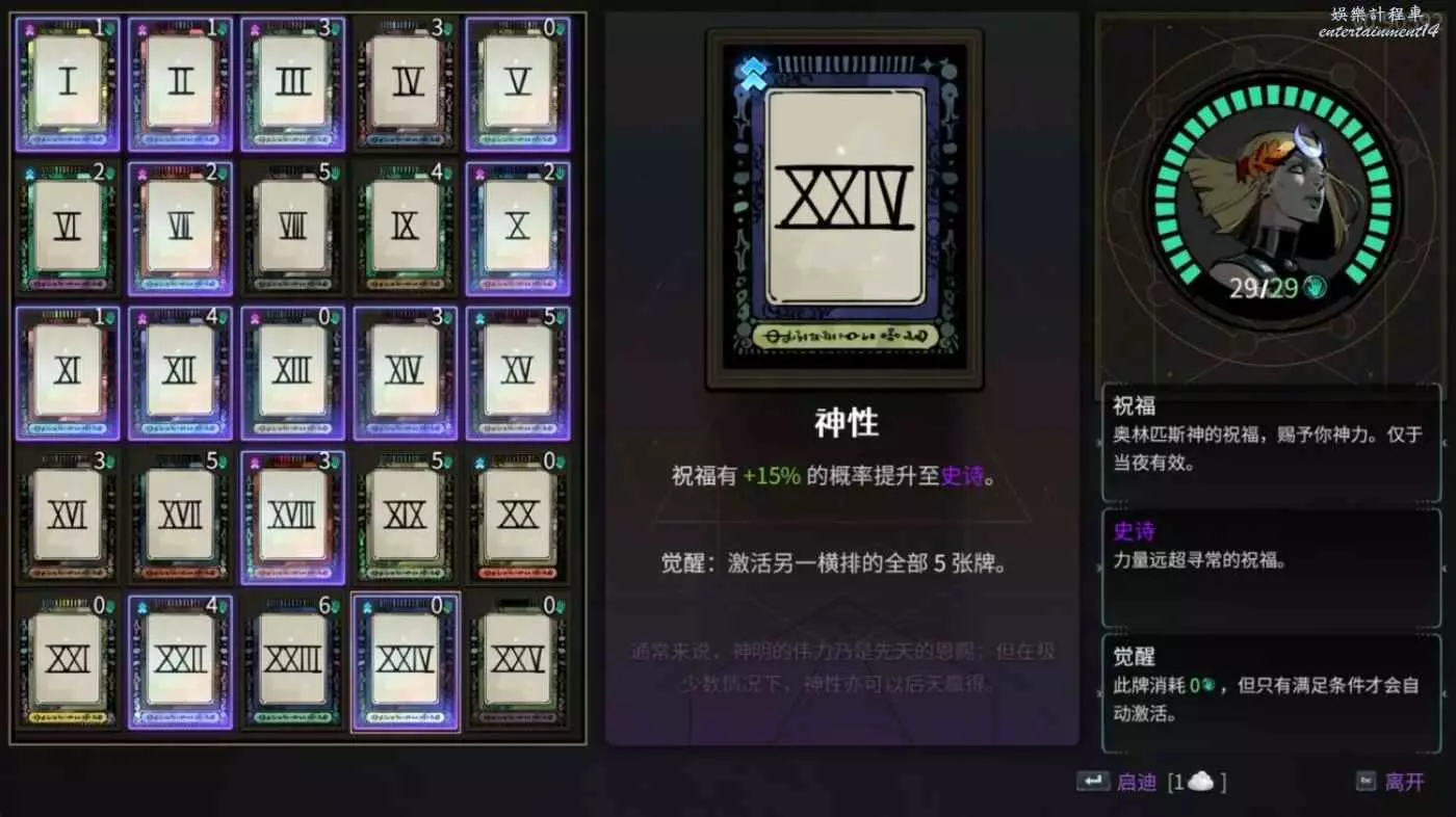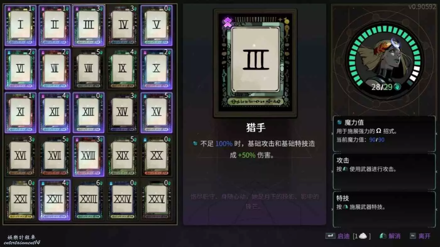 如果是白板杖的話,其實應該是用不到獵手的。悟性不高就先儘量多開提高百分比傷害和生存類的牌,骰子一定是要帶的。因為用的是杖3所以還是帶了獵手,出門白字可以達到60,法陣增傷打一些敵人的時候如果沒有投射法陣之類的祝福我感覺有點不好用。然後女術士也完全可以不開,因為我們這套輪椅基本只點右鍵就可以了,基本用不上任何蓄力有關的東西。