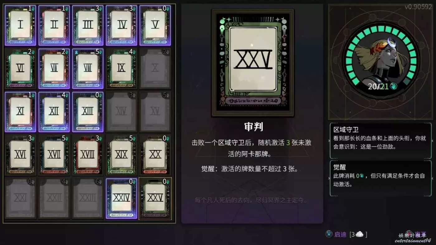 當然遊戲中最重要的戰鬥立場部分還是“塔羅牌”——各種材料可以解鎖卡牌本身、白雲可以升級卡牌(最高3級)、魂魄可以解鎖總的點數上限,然後玩家可以啟動1-5點的卡牌,其中核心樂趣大概在於滿足條件啟動“0費牌”:比如右下的0費牌啟動條件是不能啟動超過3張卡牌,但每次戰鬥後會隨機啟動三張卡,也就是說約等於可以啟動12張卡,這顯然會大幅超出可啟動卡的上限,但初始的少卡會也帶來很大的風險。