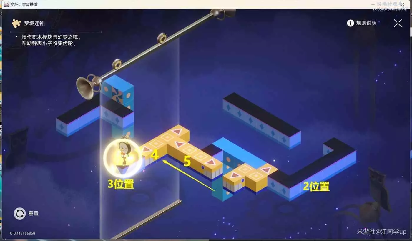 4.將4鏡子移到左上,將2黃色模組向左上移3格,將1黃色模組向左上移5格(具體位置可看圖3),【鐘錶小子】會從4位置到5位置,解密完成。