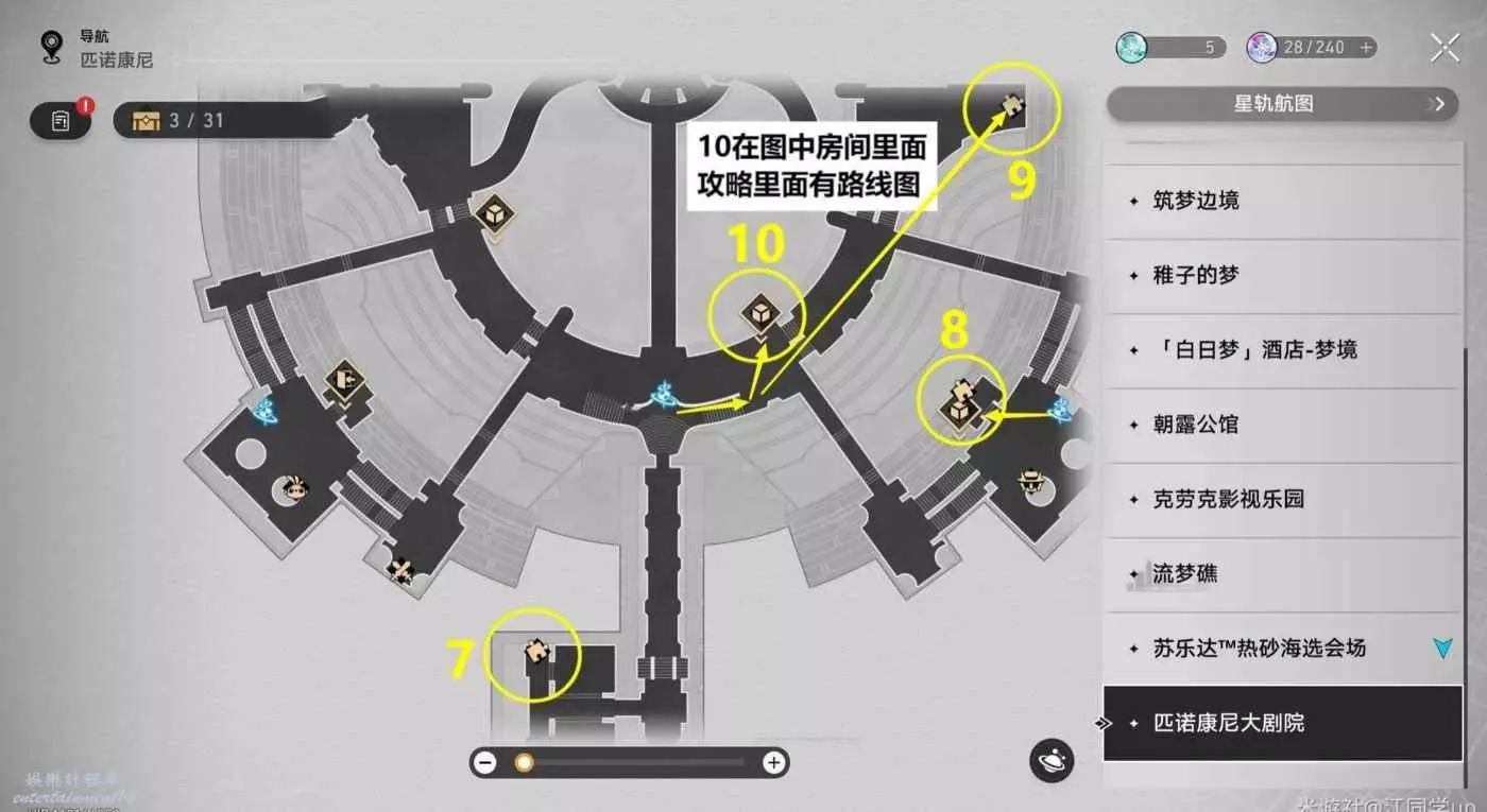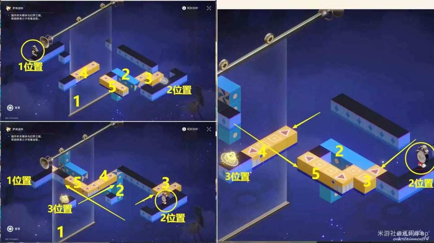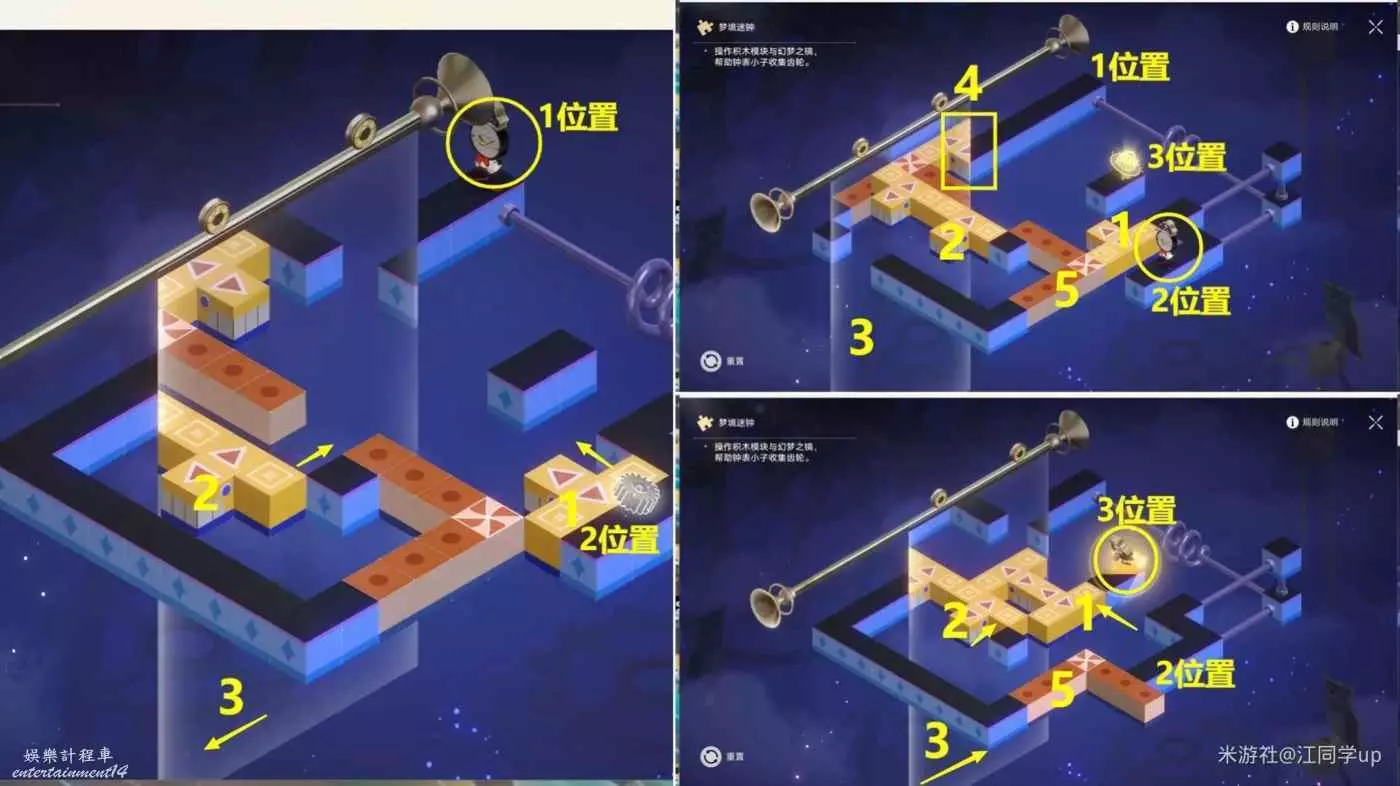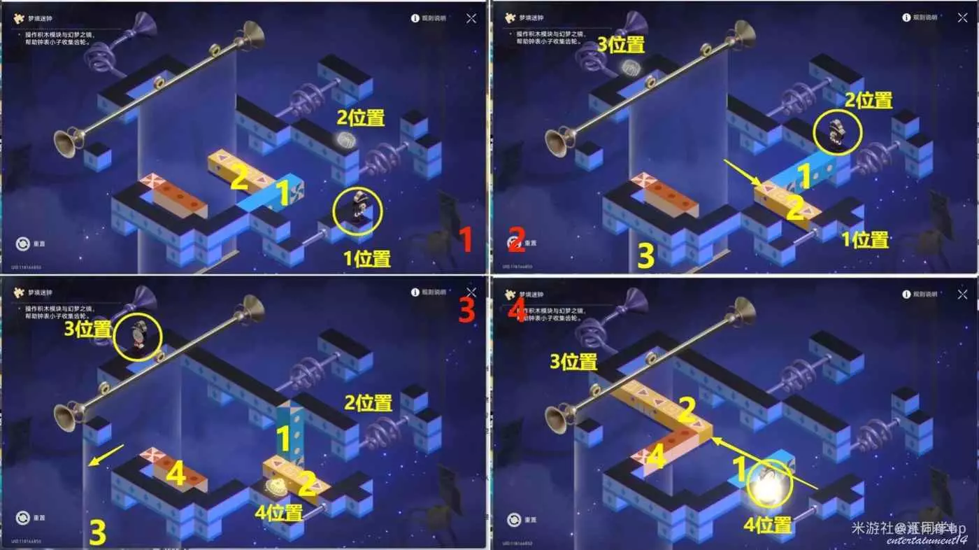 1.進入房間後,去【1酒塔】獲得充能次數,接著從【1橋樑】上去,然後去用【1開關】將【1地板】移動到左邊【1空位】處後,即可到達第10個【夢境迷鐘】位置。