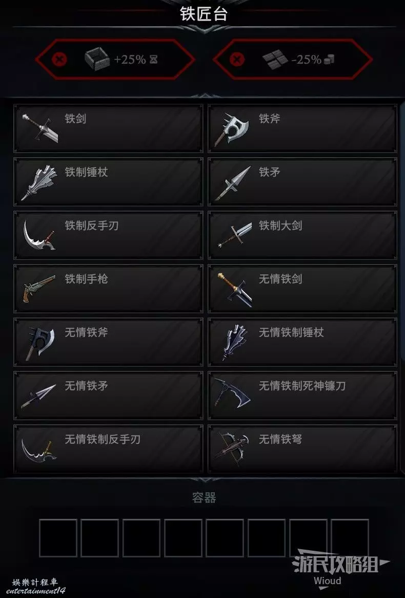 擊敗37級BOSS強盜之王昆西可以解鎖建築“鐵匠台”,在鐵匠台可以直接製作鐵劍、鐵斧等系列鐵制武器。