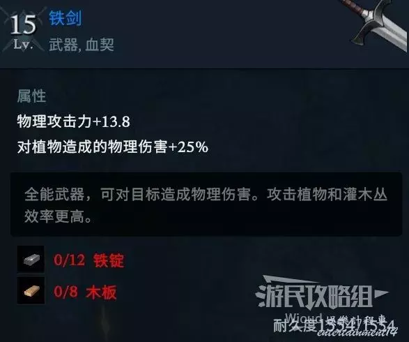 1個鐵制武器樣板(如無情鐵劍就需要一把普通鐵劍)。