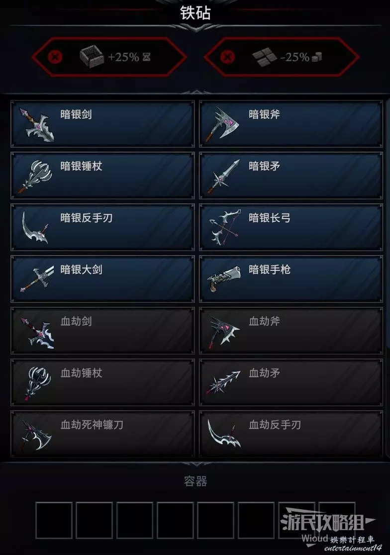 擊殺65級V型血載體被詛咒的鐵匠西瑞爾解鎖鐵砧,從鐵砧處可以直接製作暗銀系列武器。