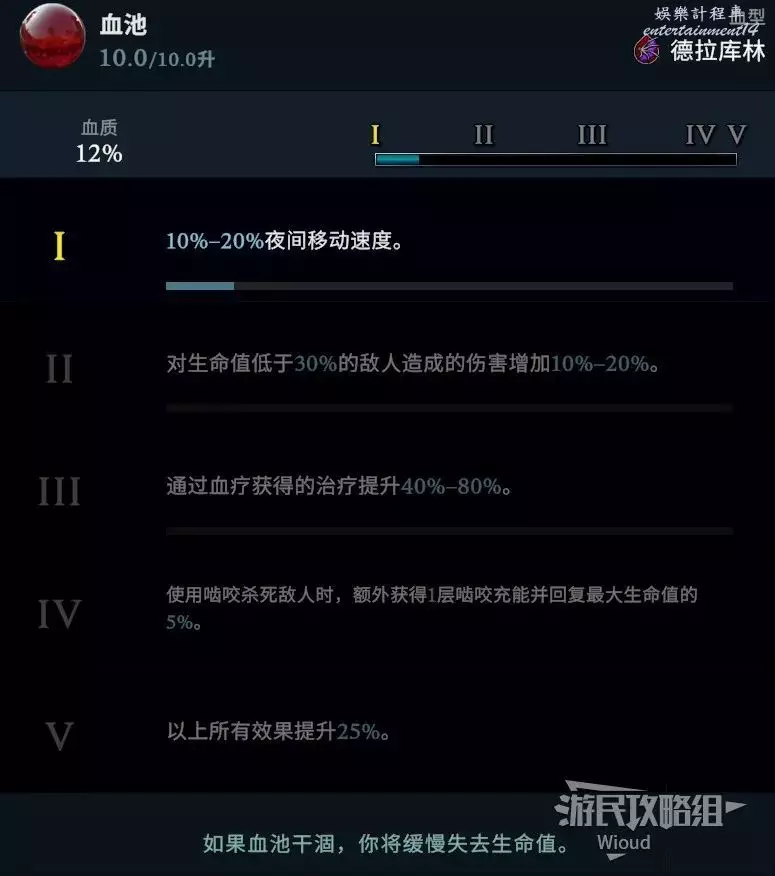 而我們攜帶的10升血液會隨著時間或攻擊敵人與受到傷害時緩慢流失,死亡會直接導致血池丟失目前容量10%的血液。