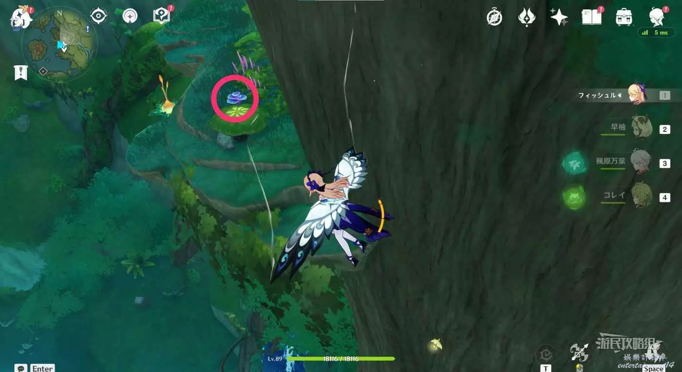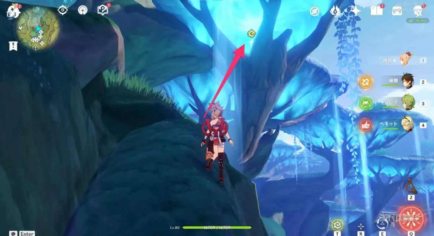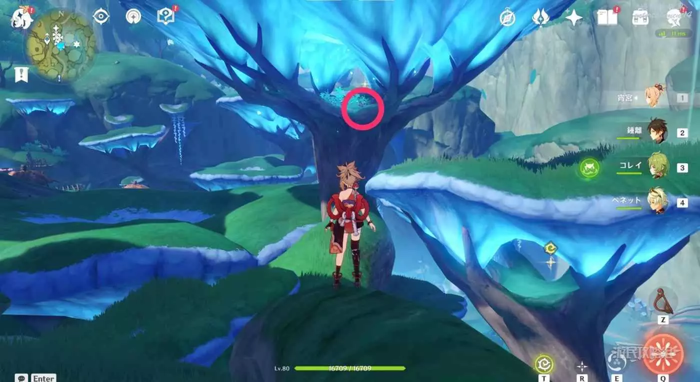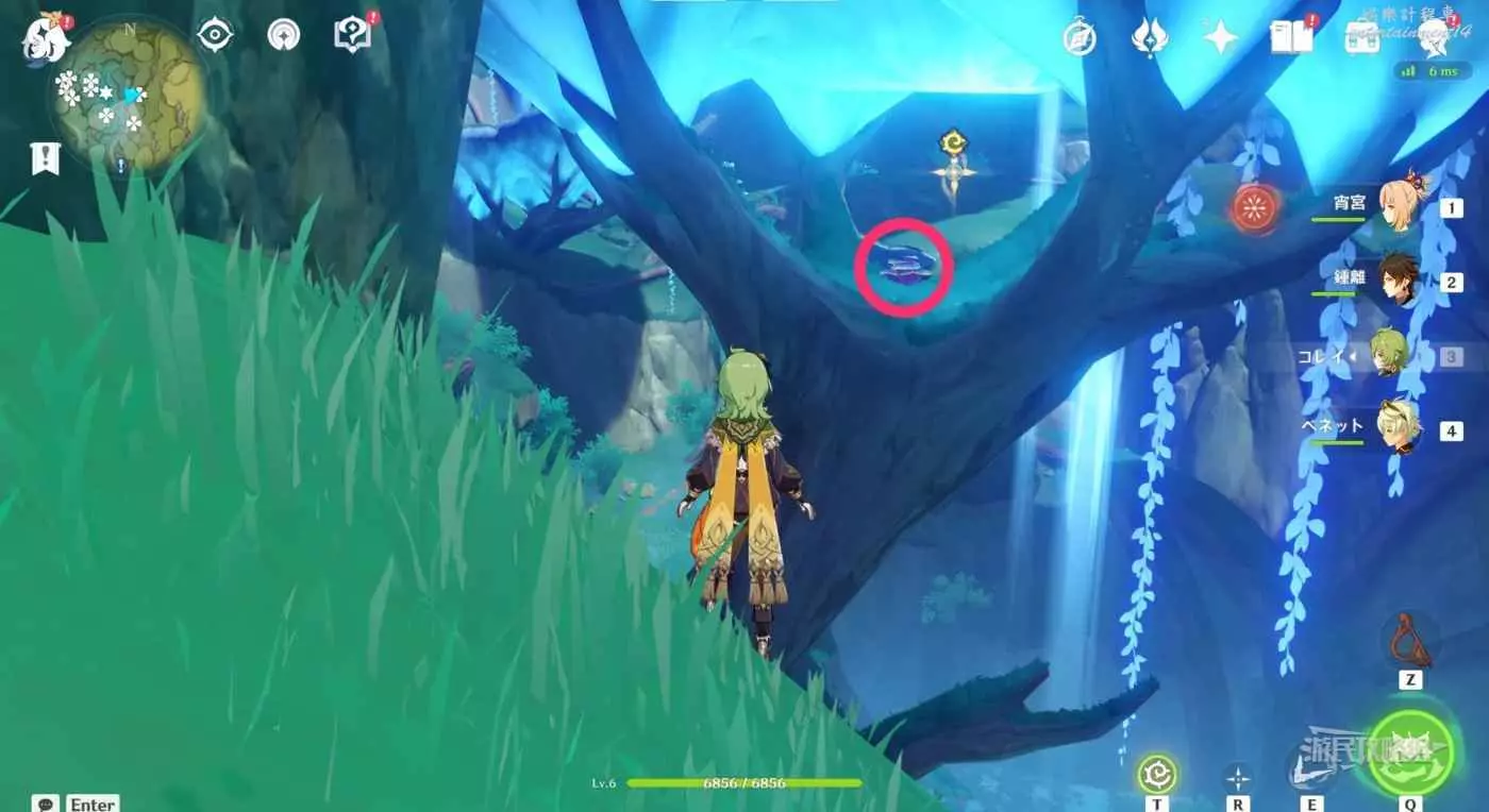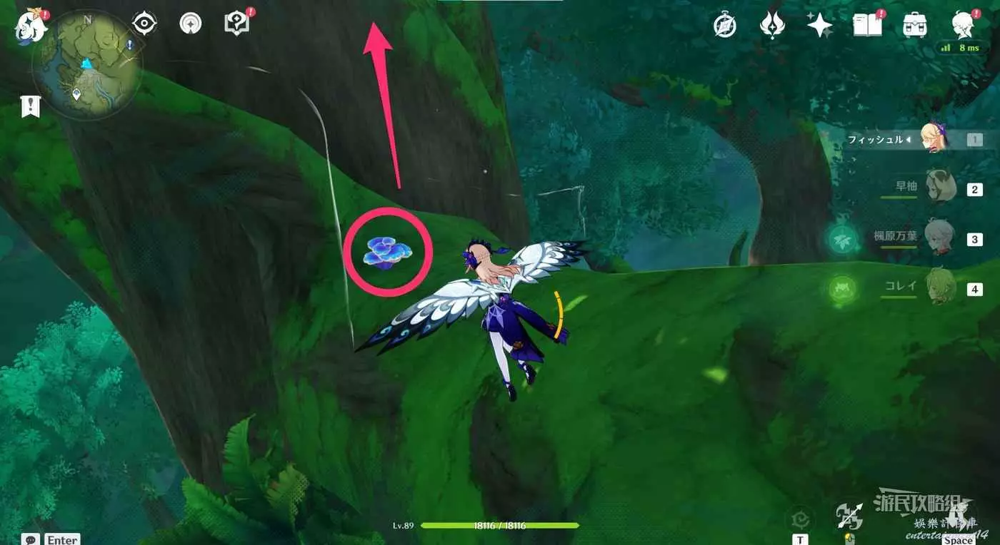 到達小廣場後,與樹枝上方的四葉印互動,拾取樹枝上的樹王聖體菇。