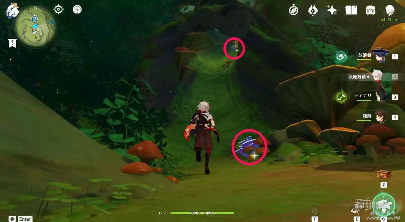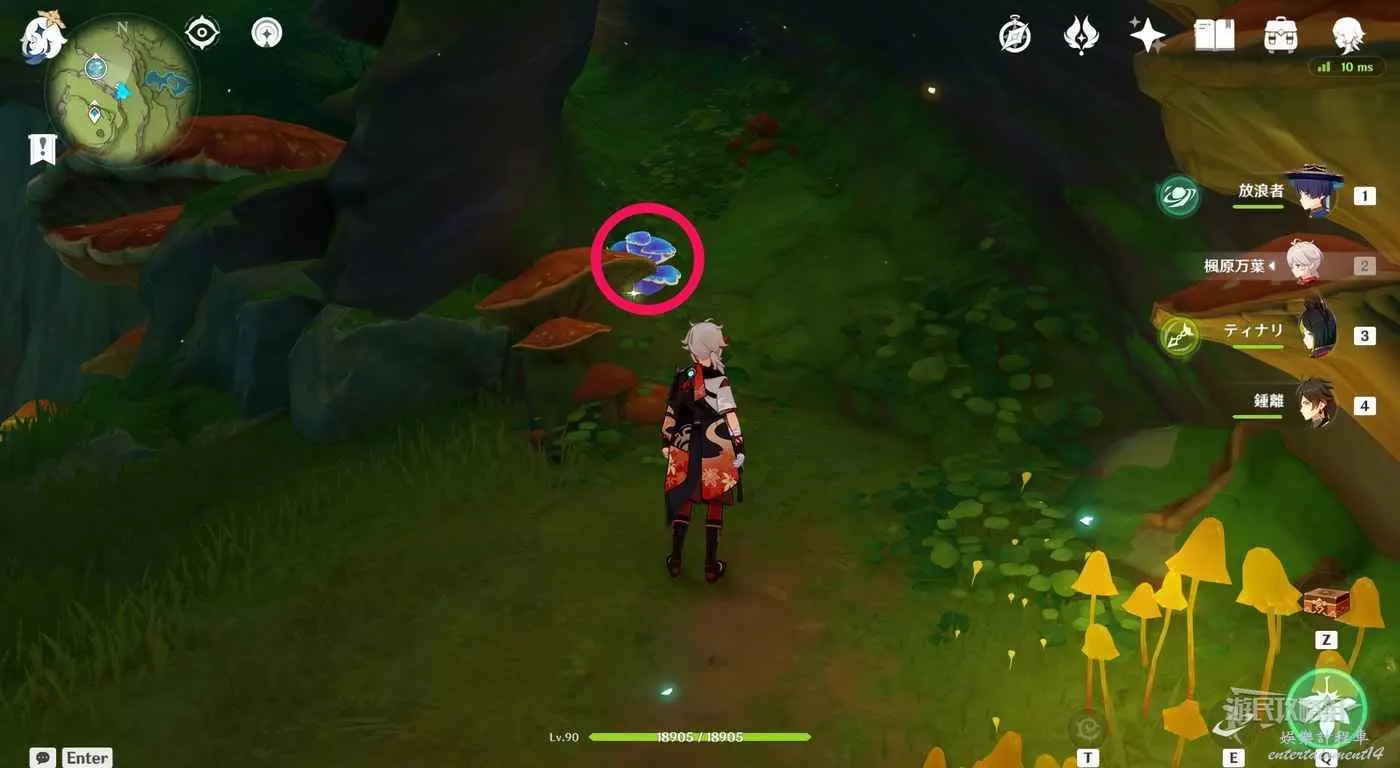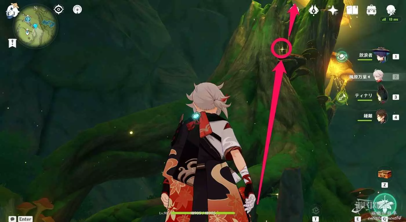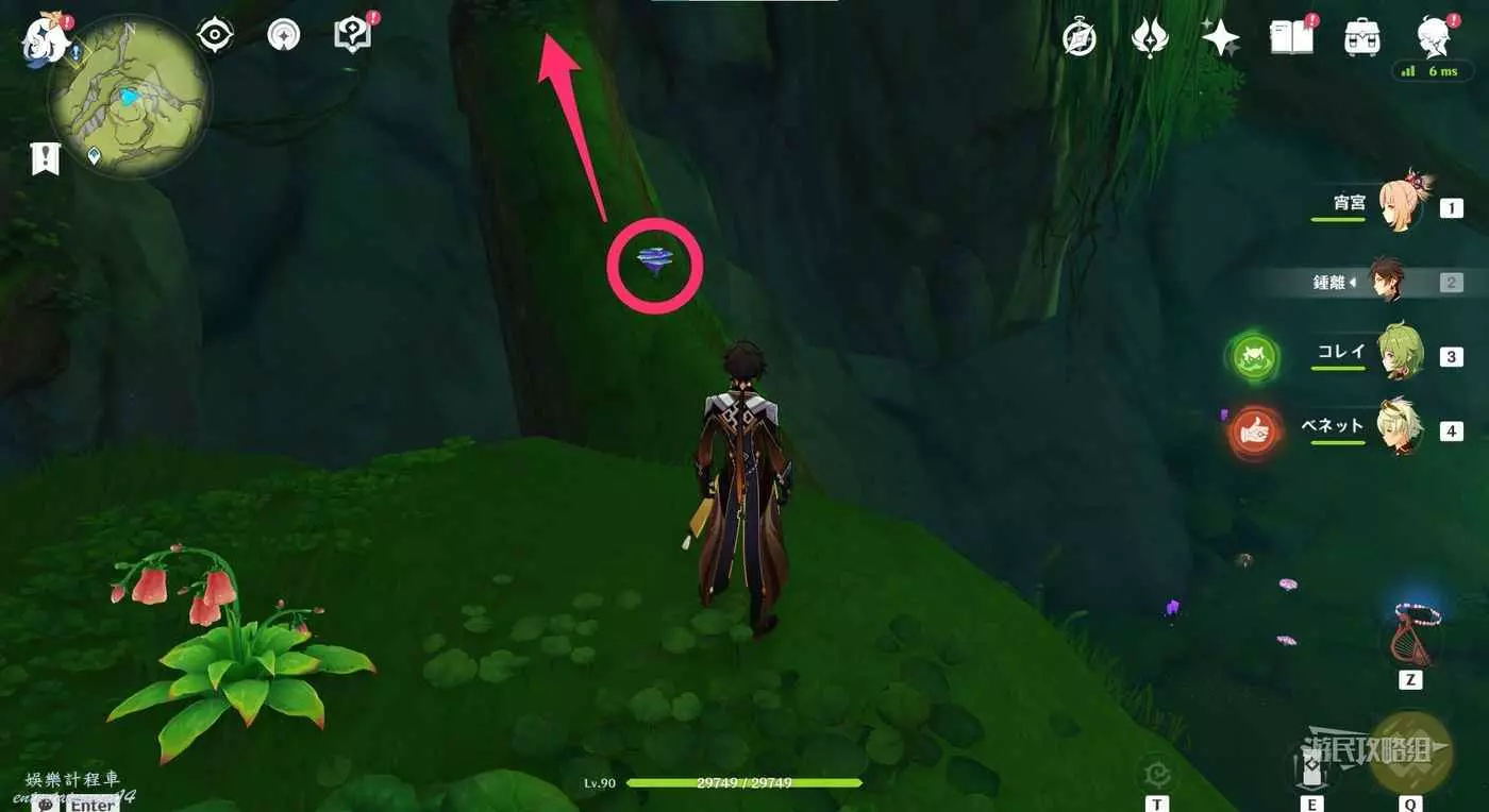 到達小廣場後,與樹枝上方的四葉印互動,拾取樹枝上的樹王聖體菇。