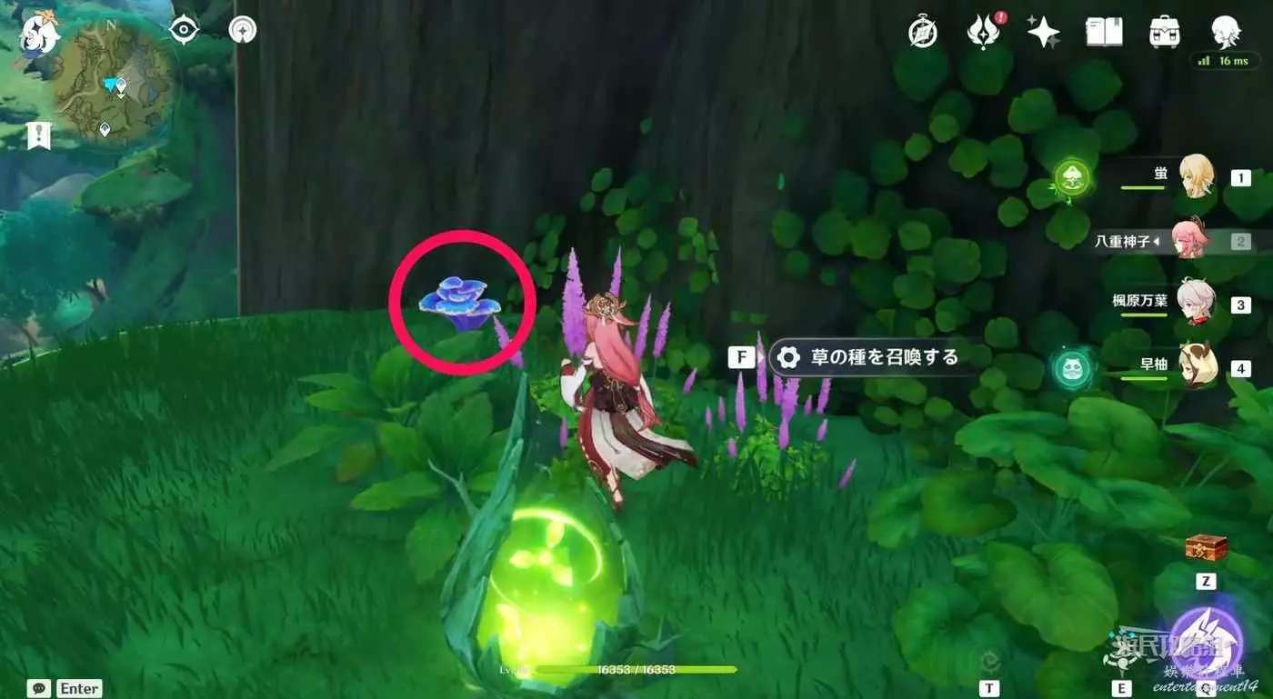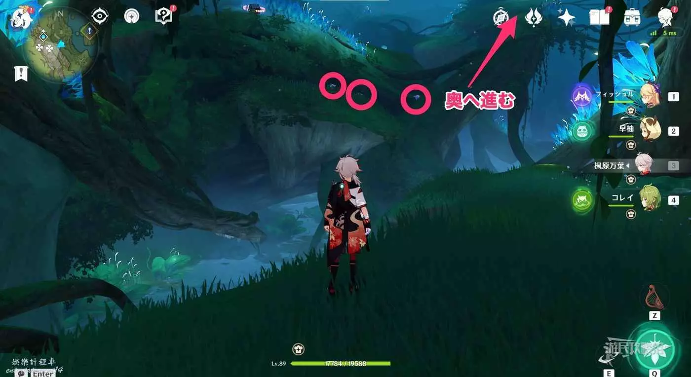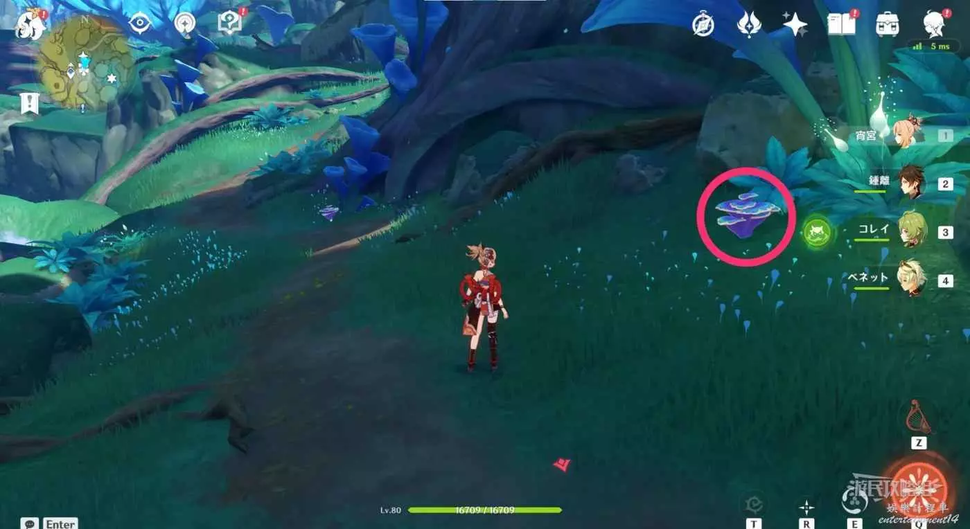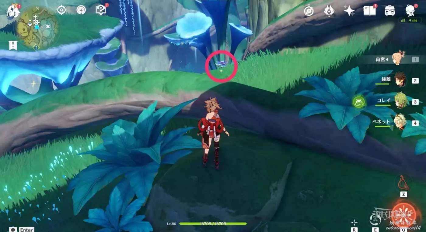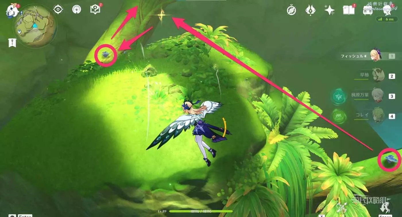 到達小廣場後,與樹枝上方的四葉印互動,拾取樹枝上的樹王聖體菇。