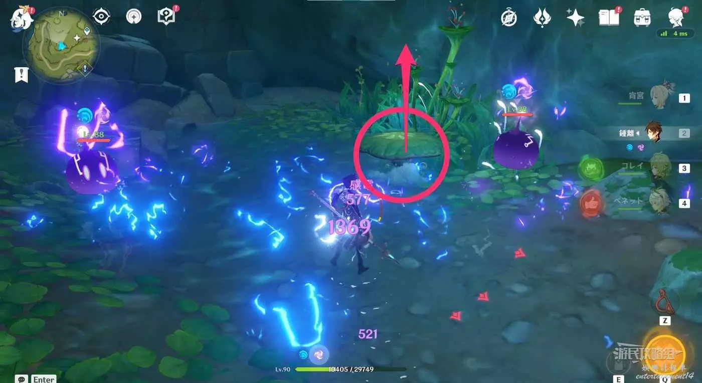 穿過樹枝後,用雷元素集中旁邊的跳跳蘑菇,使用跳跳蘑菇或上空的四葉印。