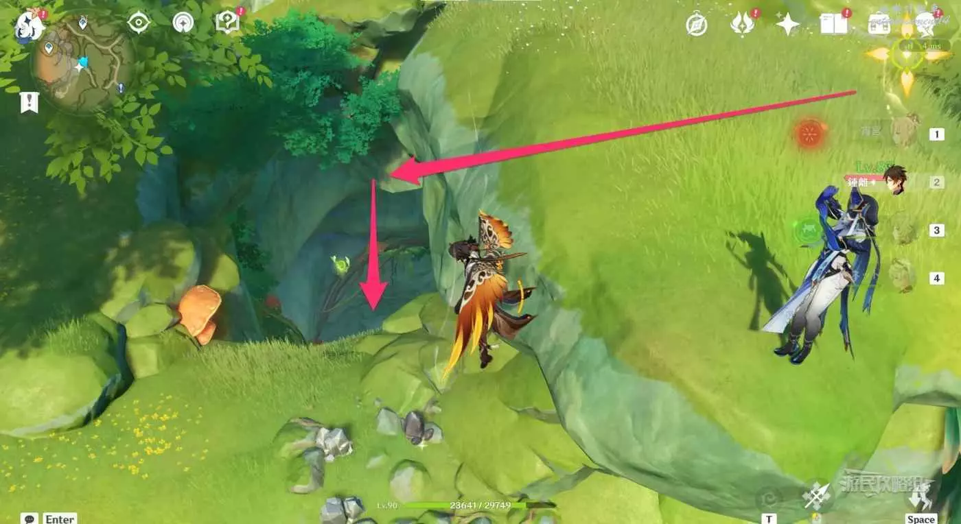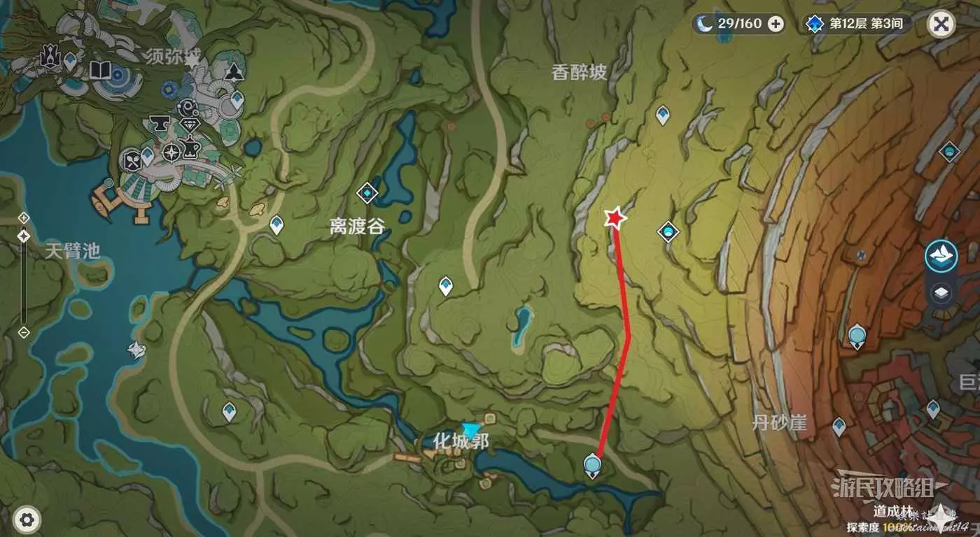 傳送到秘境有頂塔,往東南邊下圖標記所示方向的懸崖下方飛。
