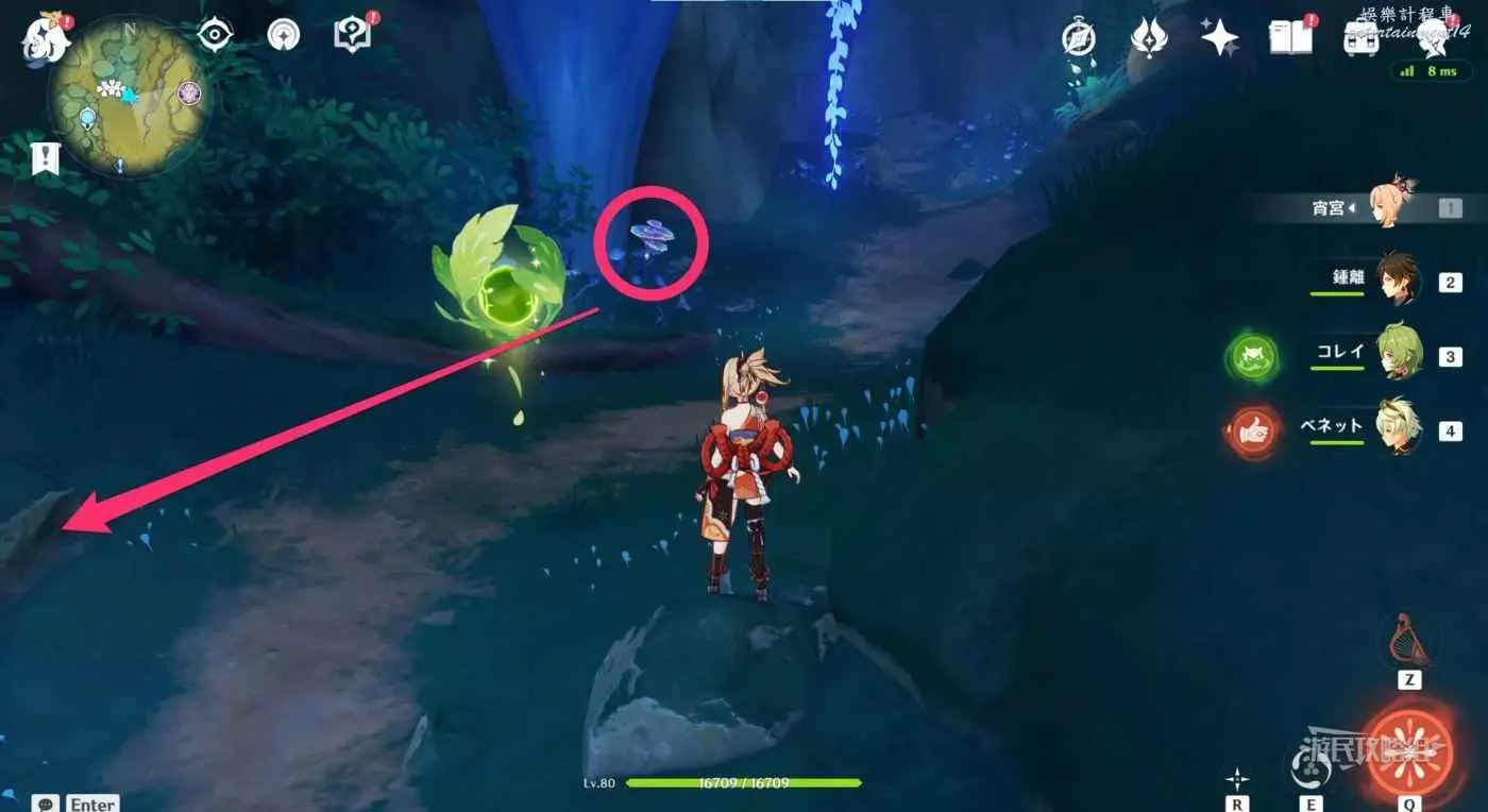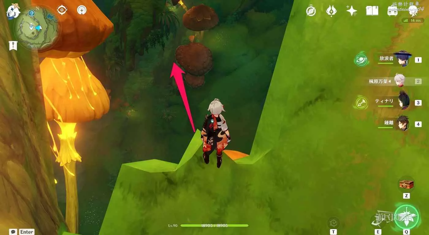 拾取上一個之後,參考下圖箭頭所示方向移動到蘑菇傘下方。