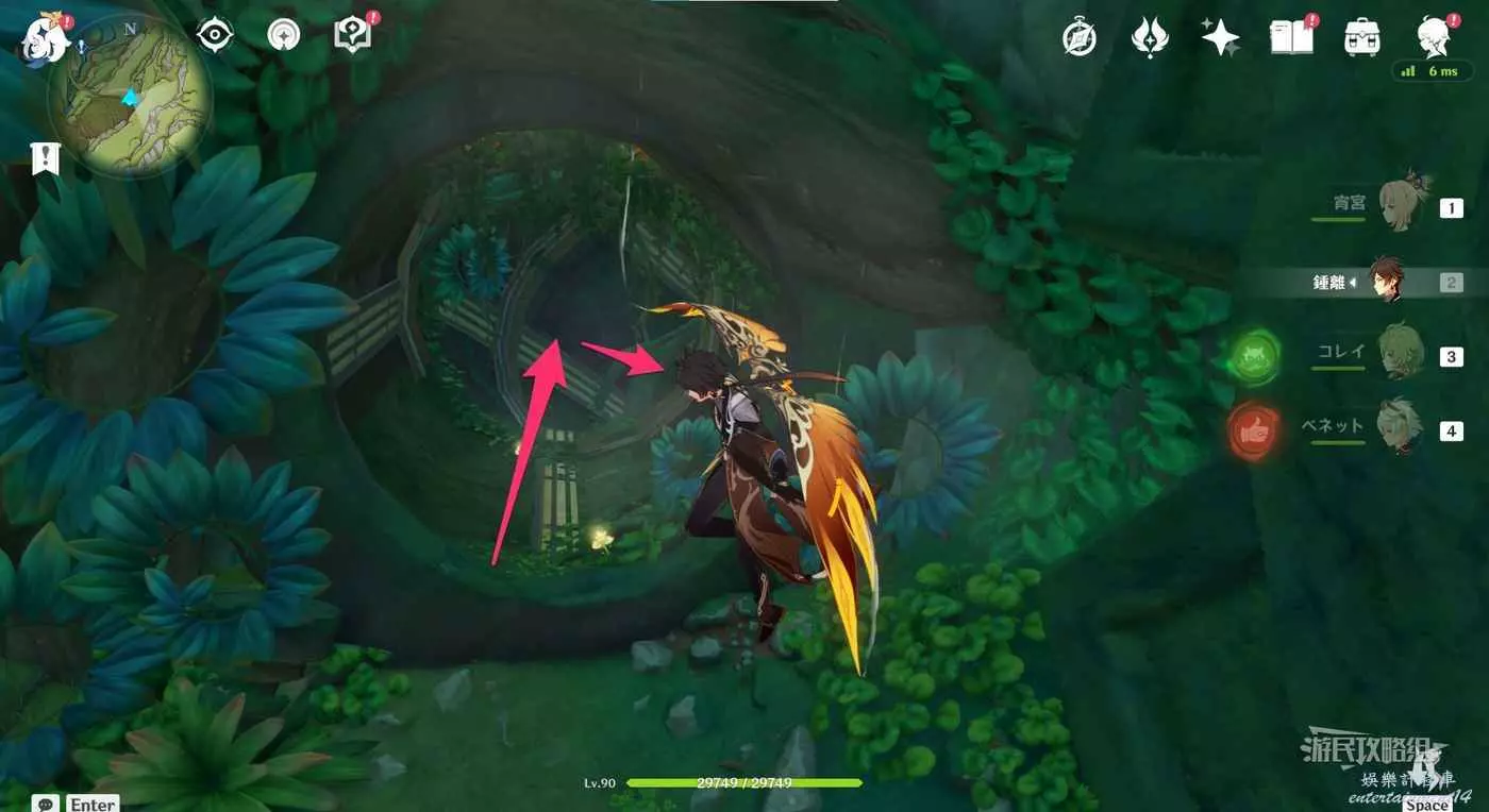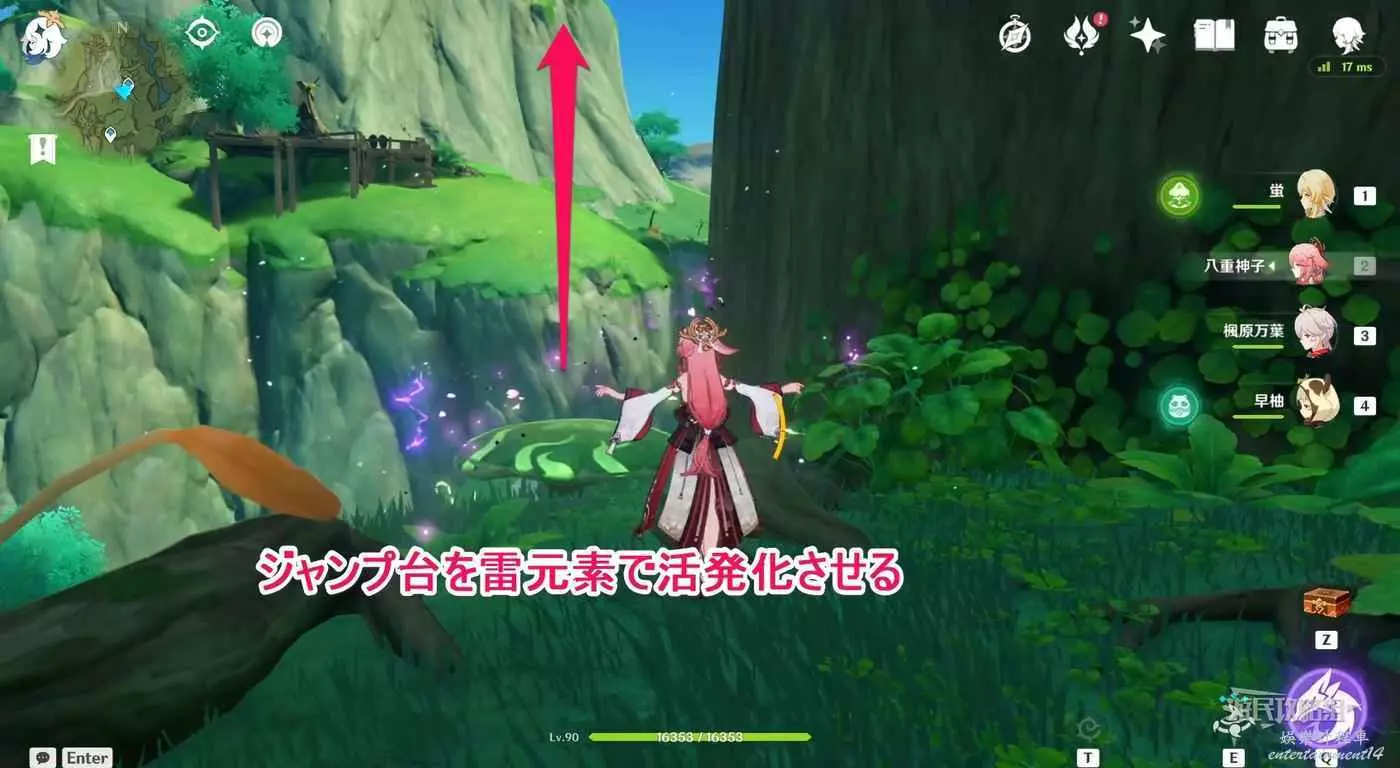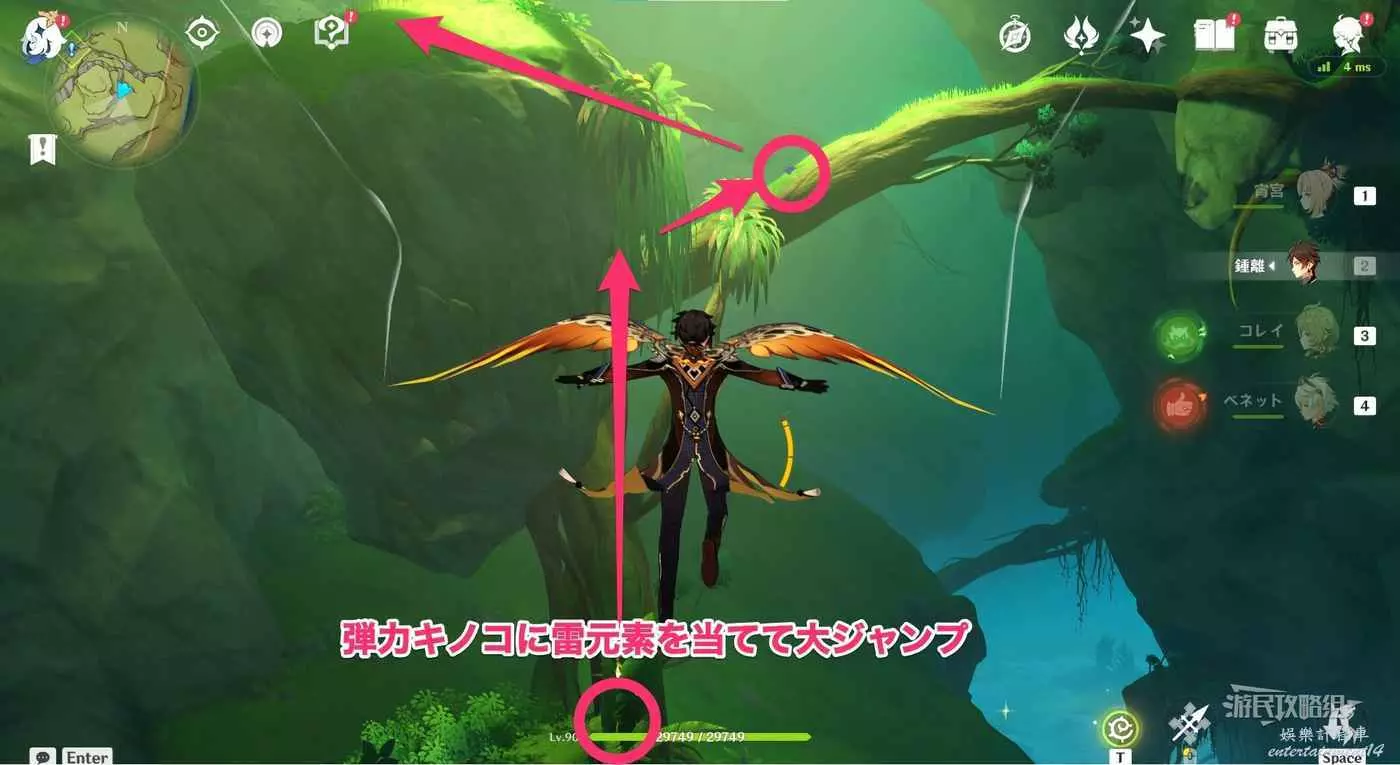 用雷元素啟動附近平台上的彈跳蘑菇,利用蘑菇往上飛到達上方平台。