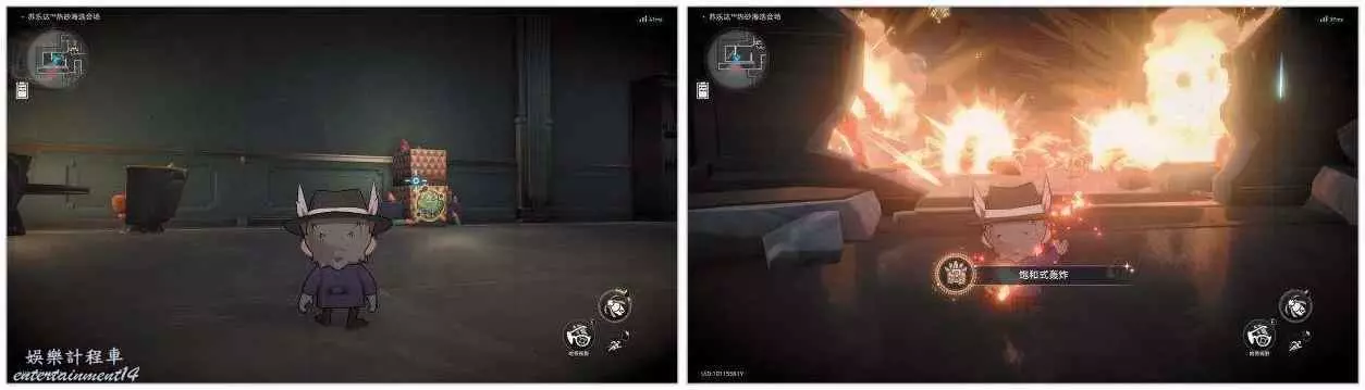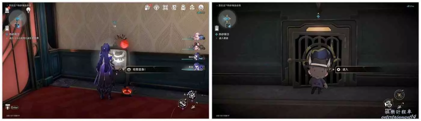 進入後與引導員對話結束後,調查電視機變身哈努後從通道進入房間。