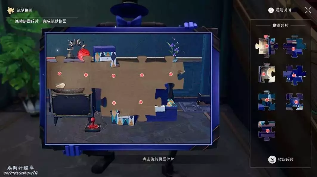 進入房間先和拼圖觸發對話,然後要求去收集三個拼圖碎片,從第一個傳送上去然後推花瓶將下方敵人擊倒,碎片1之後下樓拾取,然後繼續向前走可以拾取到碎片2,通過第二個傳送火箭拾取碎片3,需要注意等待敵人轉身再傳送,最後返回去獲取碎片1即可。