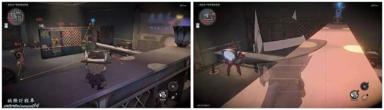 然後前進坐電梯前往-1層,變身哈努通關火箭來到架子上,推動花盆1將敵人1擊暈,然後回到地面,趁敵人2背對的時候沿橙色路線靠邊沖到屏風後,等敵人的警戒狀態消失再觀察敵人3看向內側時衝過去通過火箭達到第二個櫃子,推動花盆2將敵人3吸引走,然後再坐火箭回到地面去拾取火箭筒,將敵人2和敵人3都幹掉。