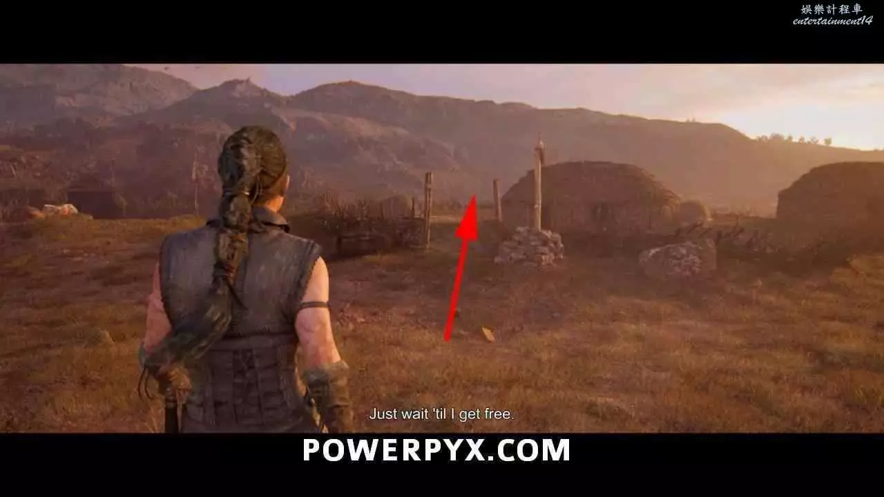 穿過昏暗的山脈區域後,觸發與一群蒙面和噴火敵人的戰鬥,從木樁中救出一個人。之後再經過一天,與救出的人一起前進,經過一座斷橋後,這裡需要跟著他下山去河邊,先不要跟他走,左轉去探索一片支線區域,這裡在稍微下坡的地方可以看到聖柱,就在到達被摧毀的村莊之前。