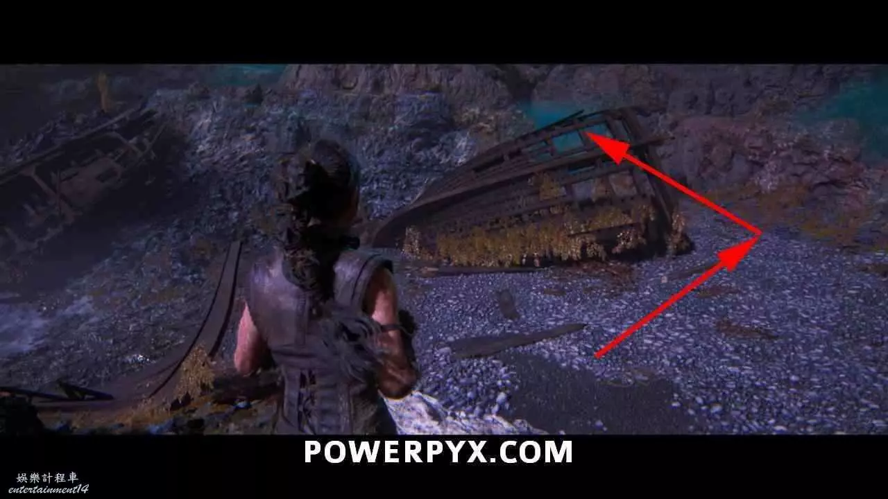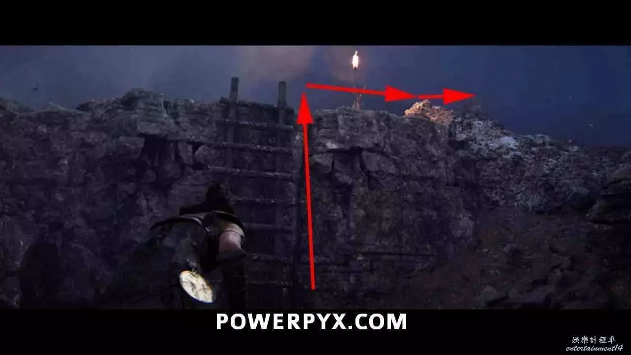 在進入一個被水淹沒的洞穴部分(水位齊腰)的一段過場動畫後,需要與2個火堆互動才能繼續推進主線劇情,用第二個火堆架起一座橋,穿過橋可以看到一條通往洞穴更深處的小路,這裡與右側互動找到隱藏台階,跳下去即可看到聖柱。從劇情路線往右看也能看到。