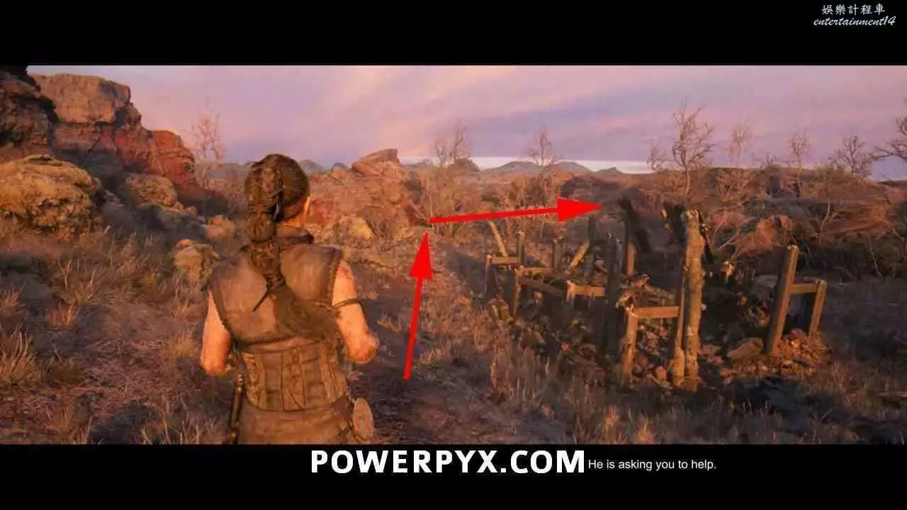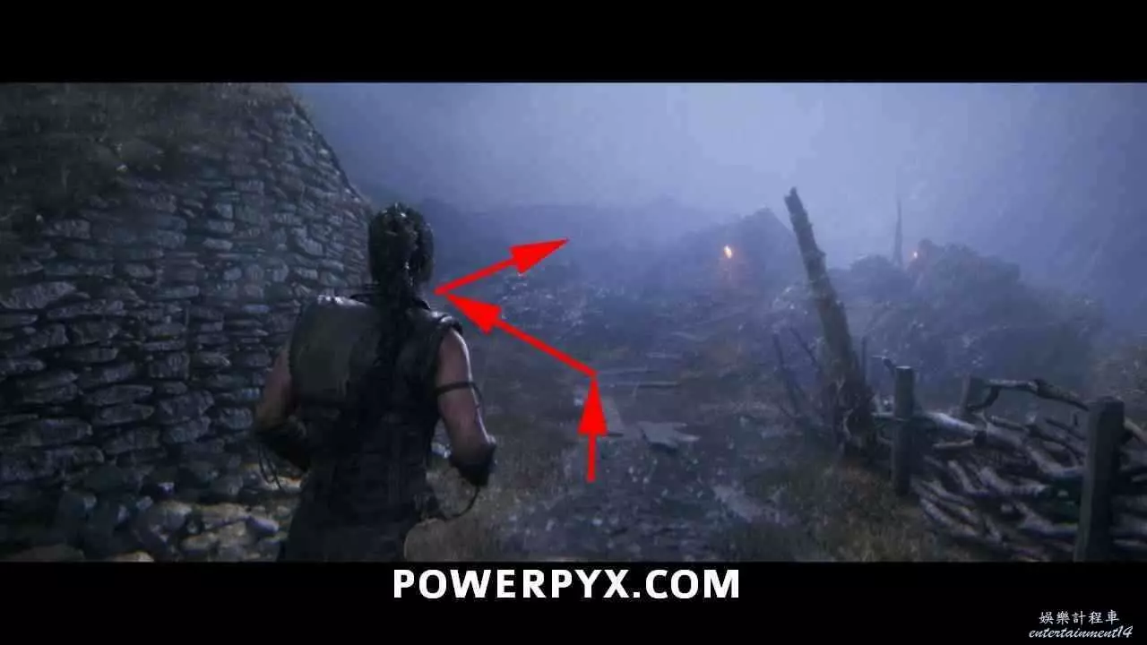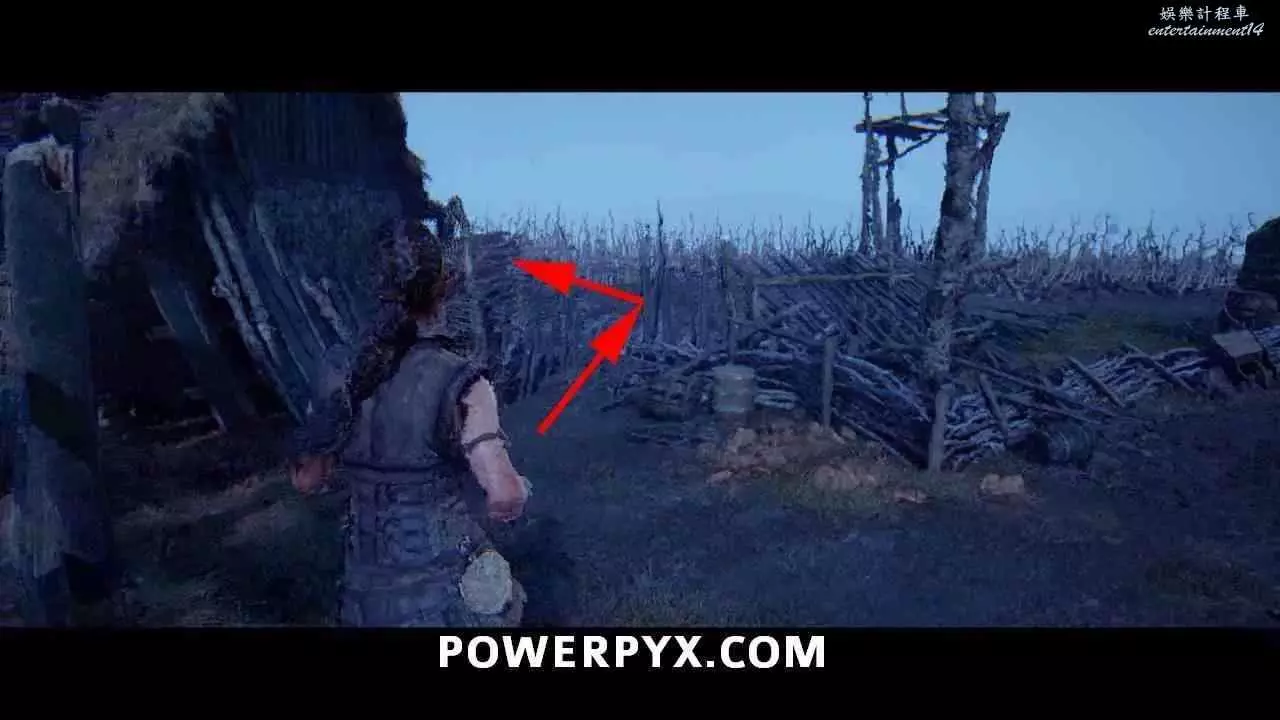 穿過村莊並拿到鏡子後,在燃燒的村莊中觸發戰鬥,之後沿路一直走,直到再次進入夜晚,穿過木板搭成的谷倉,在谷倉裡有個吊著的屍體(劇情路線),離開谷倉後左轉,進入有許多木樁的區域,繼續往左走可以看到一堆碎石,在碎石後的右側可以看到聖柱。