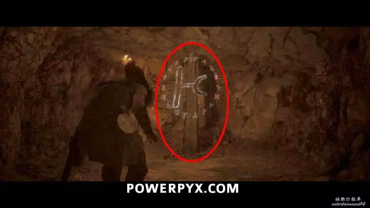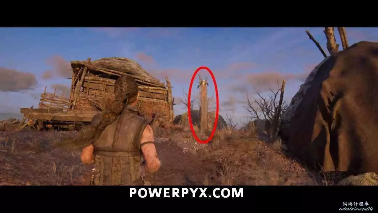 在第三章開頭與另外兩個人一起前進,走下坡進入被摧毀的村莊時,左轉探索房子後面的角落,地面上有裂縫,即可看到聖柱圖騰。
