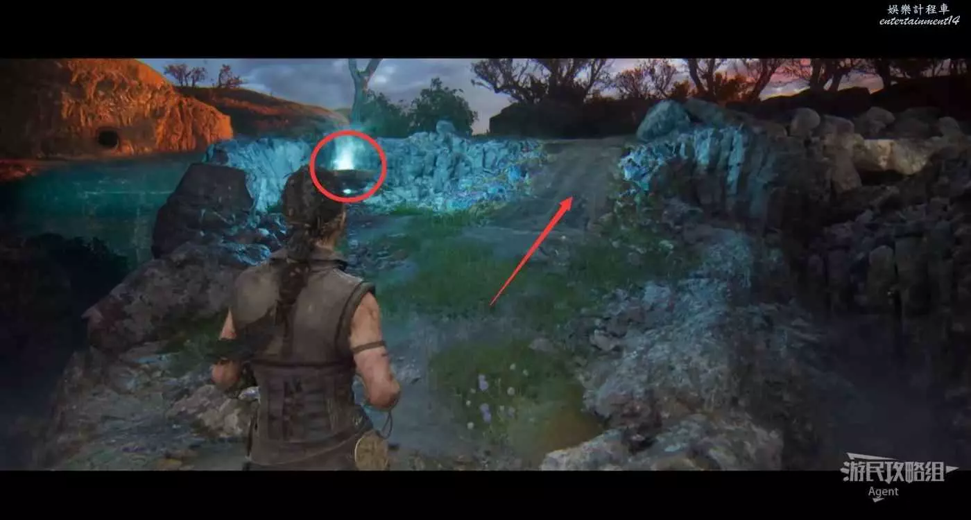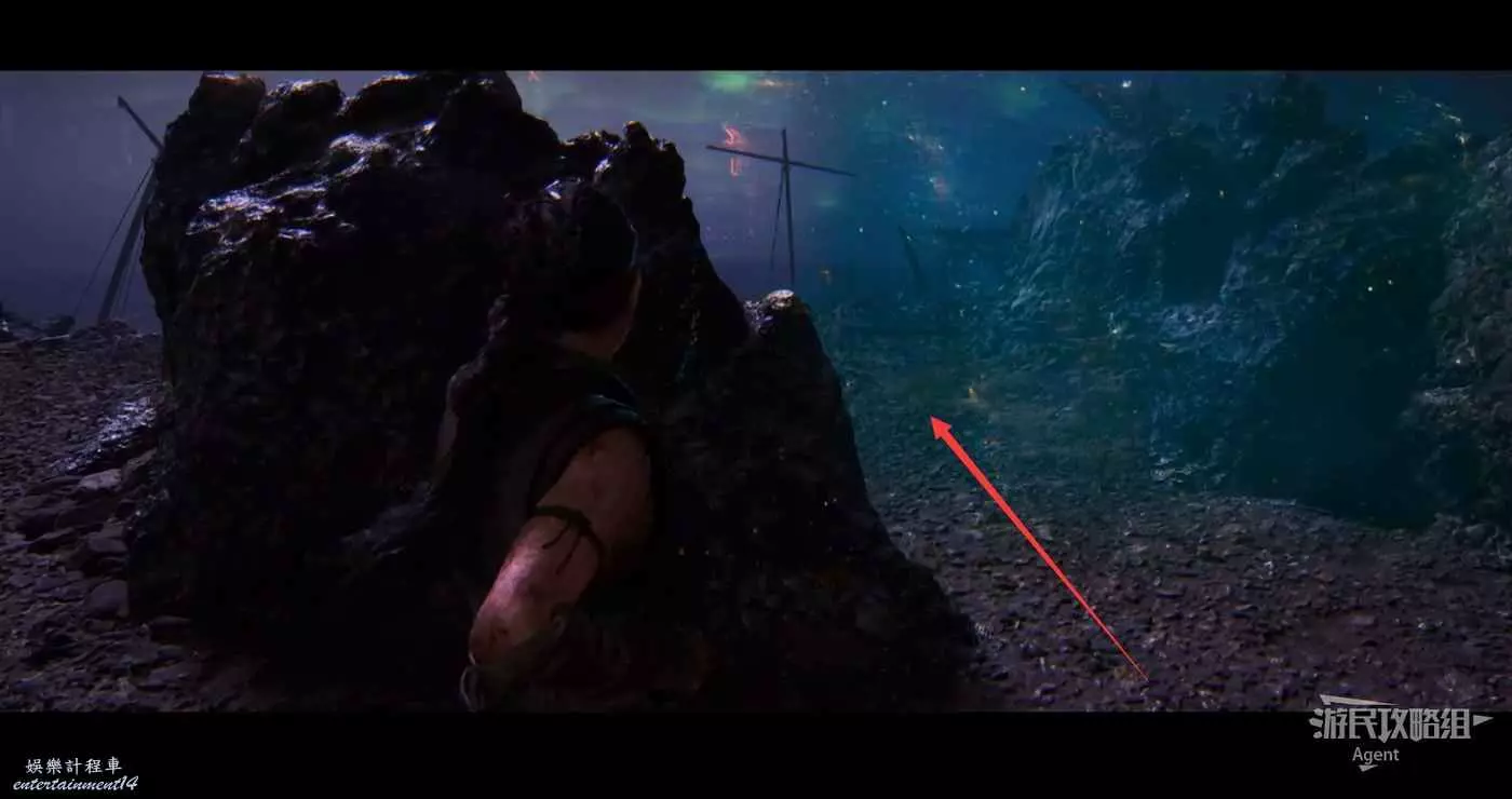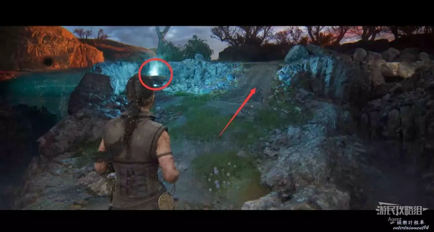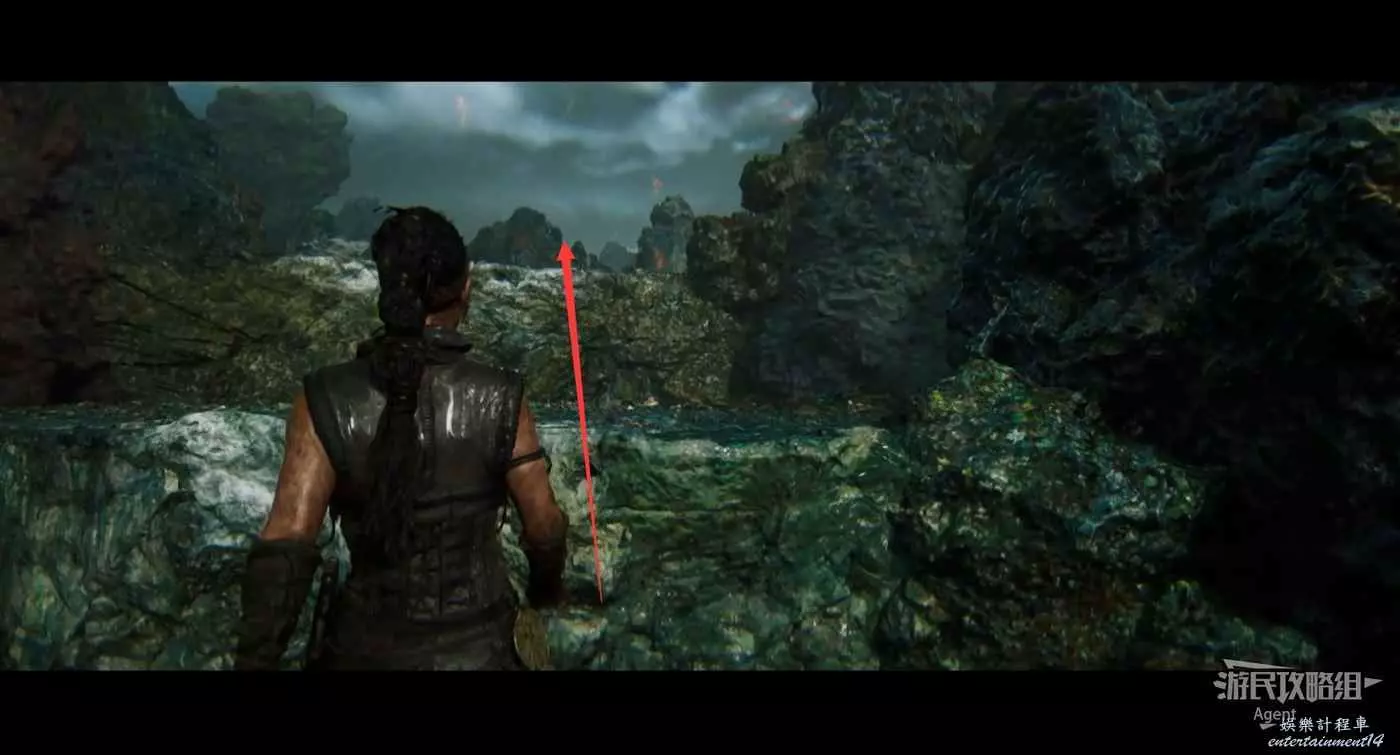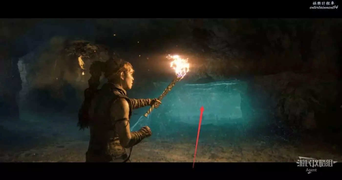 涉水往前走,到高處熄滅火盆,面前下方就會出現通路。