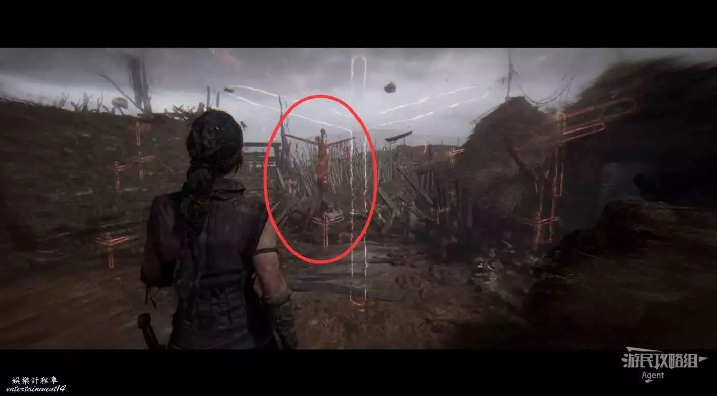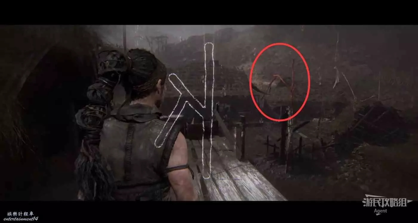 鑽進房子裡,看到火堆上吊著屍體,爬上梯子往右看可以看到通往目的地的棧橋。