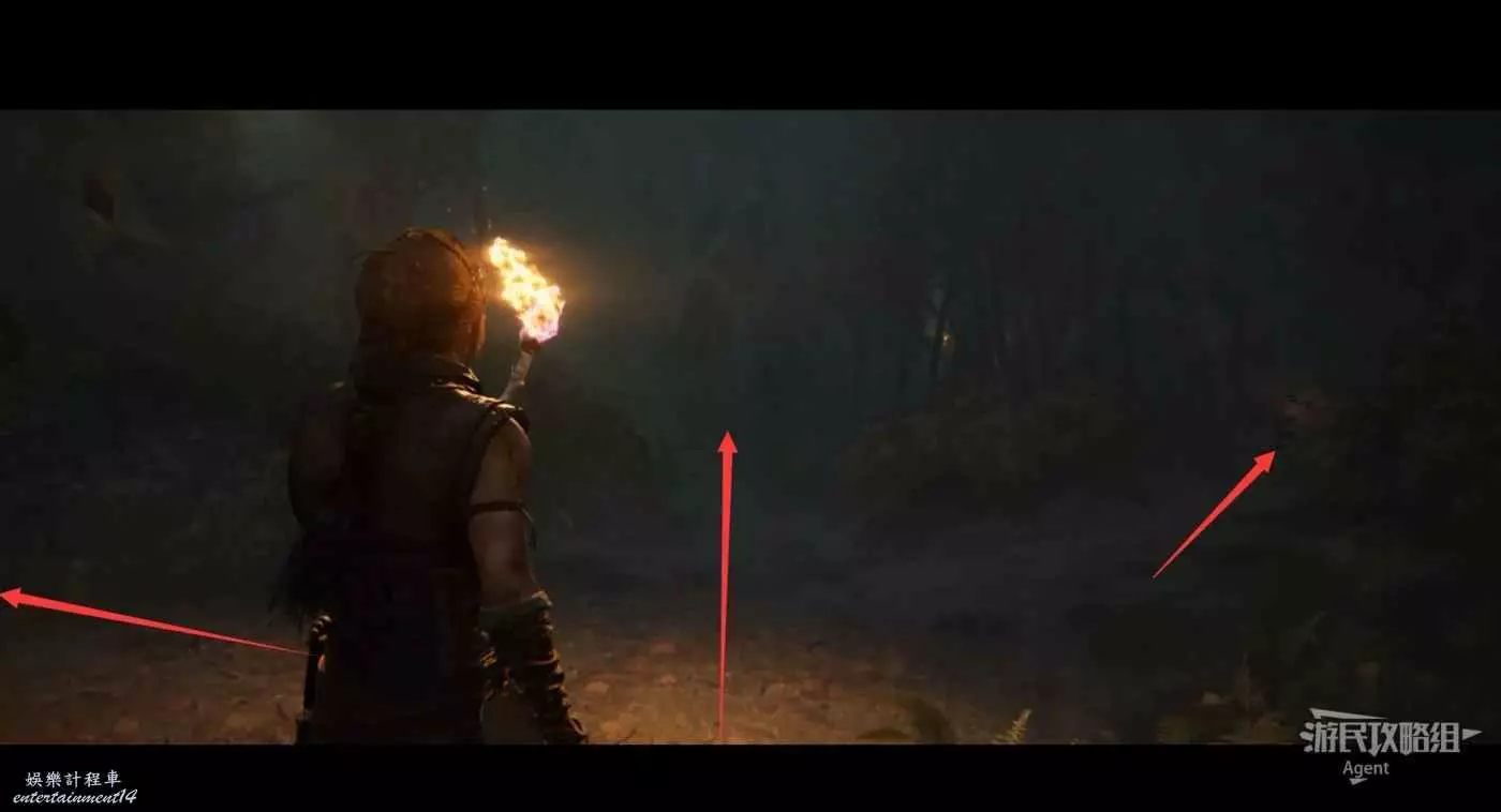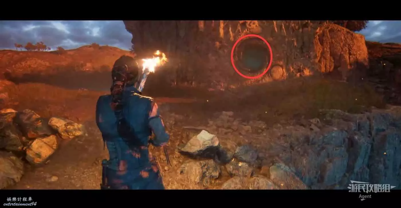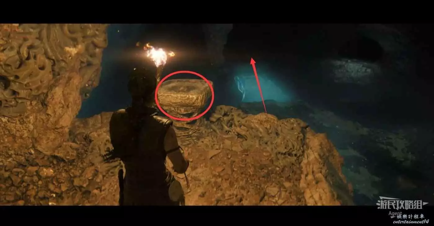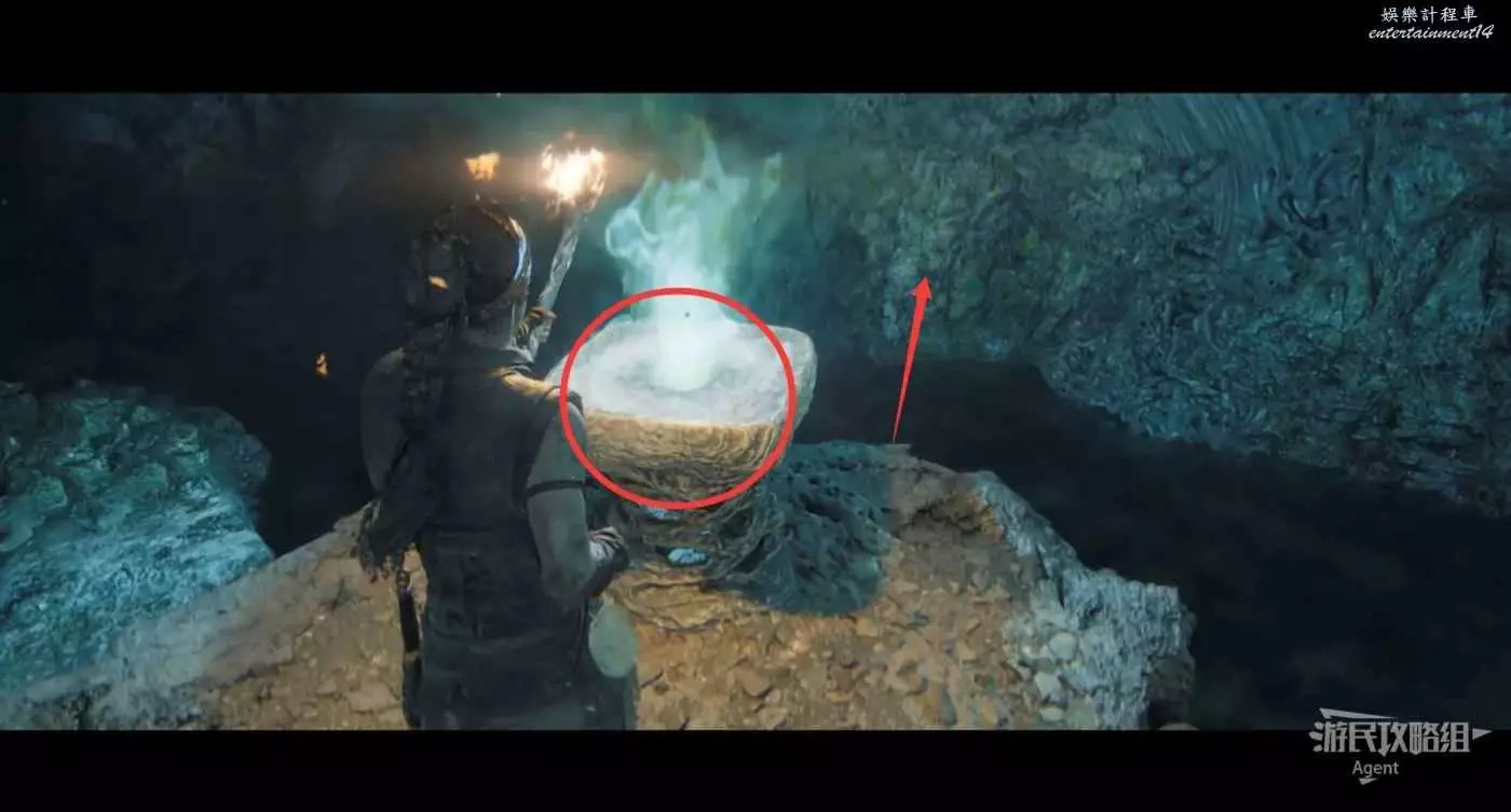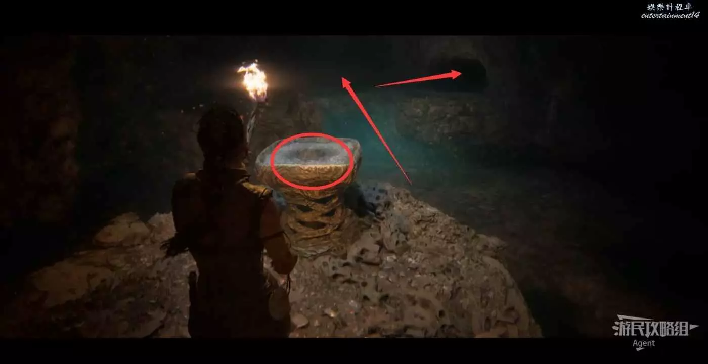 依次序重新點燃第一、第二個火盆,然後就可以抵達高處的圓洞了,把火把放進圓洞裡。