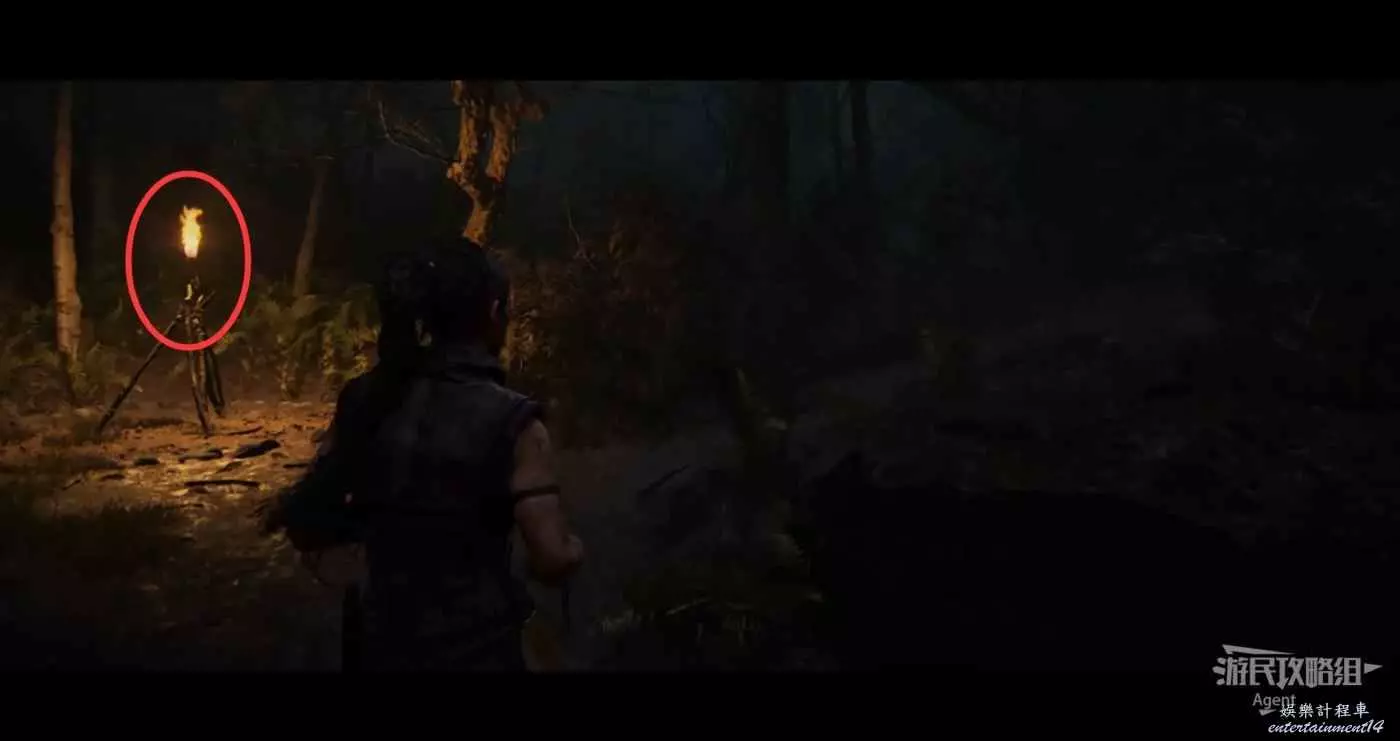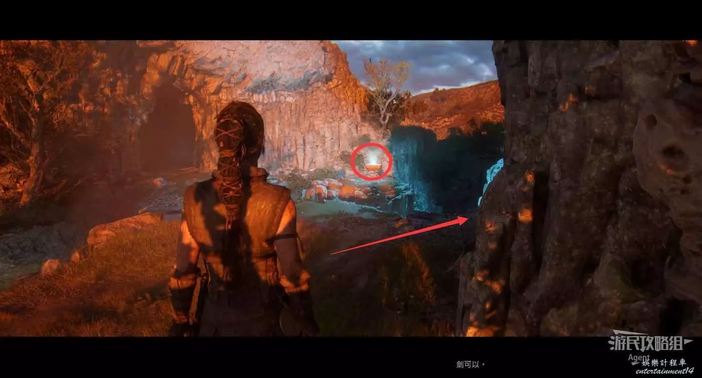 點燃火盆,發光的部分就會變為實體。走上坡,鑽進洞。