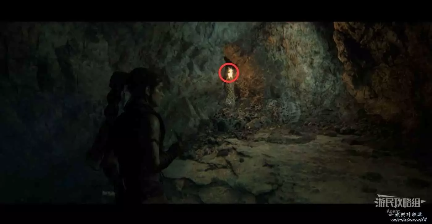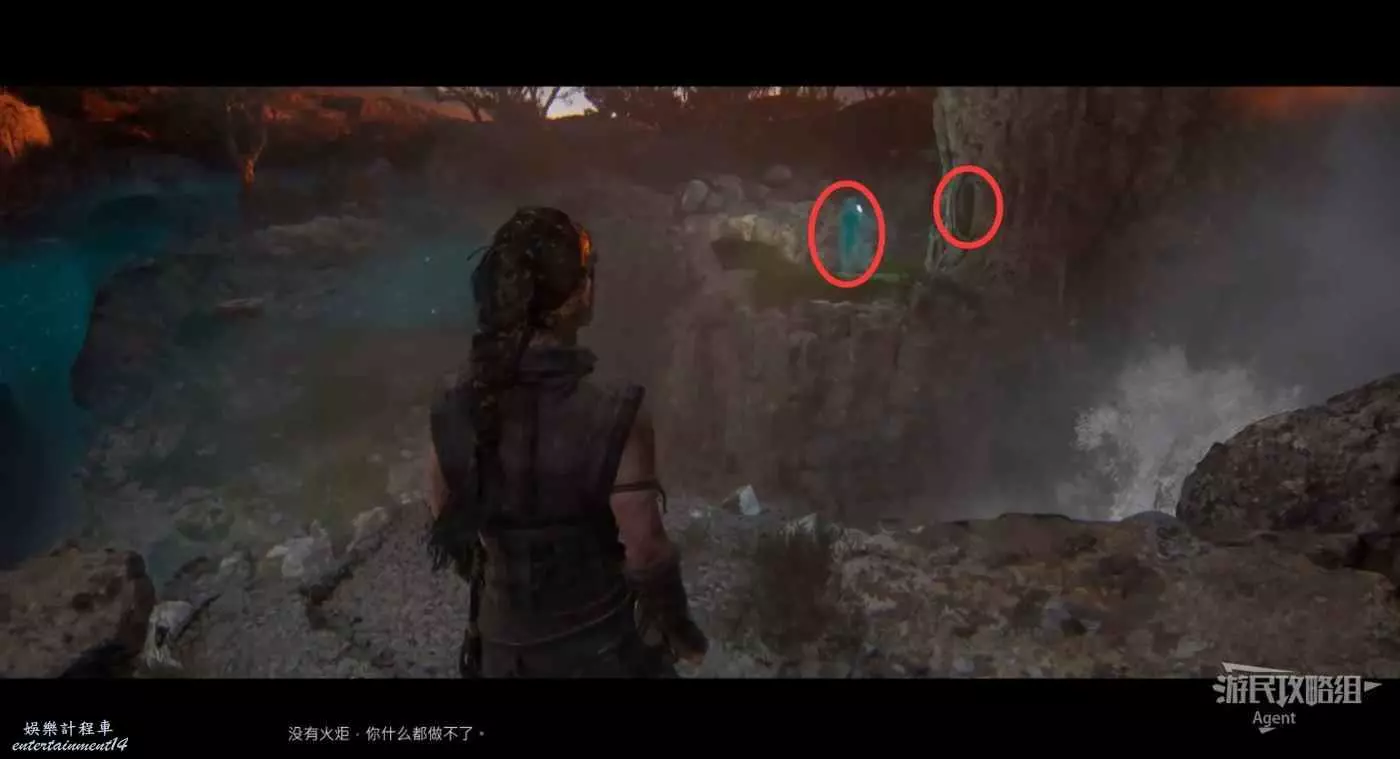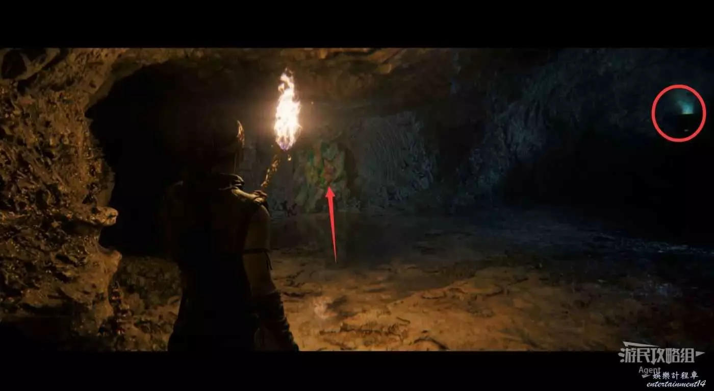 往前走火把又被水流澆滅了,到左邊找到火炬重新點燃火把,然後去點燃下圖圈出的高處的火炬。