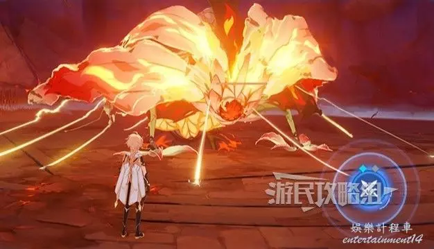第一關挑戰爆炎樹的重點是依次破壞花冠和根部的火元素凝核,推薦攜帶水/冰元素角色。與場地中間的鑰匙互動可以更換陣容,並調整交涉策略,選擇【開始挑戰】即開始計時。