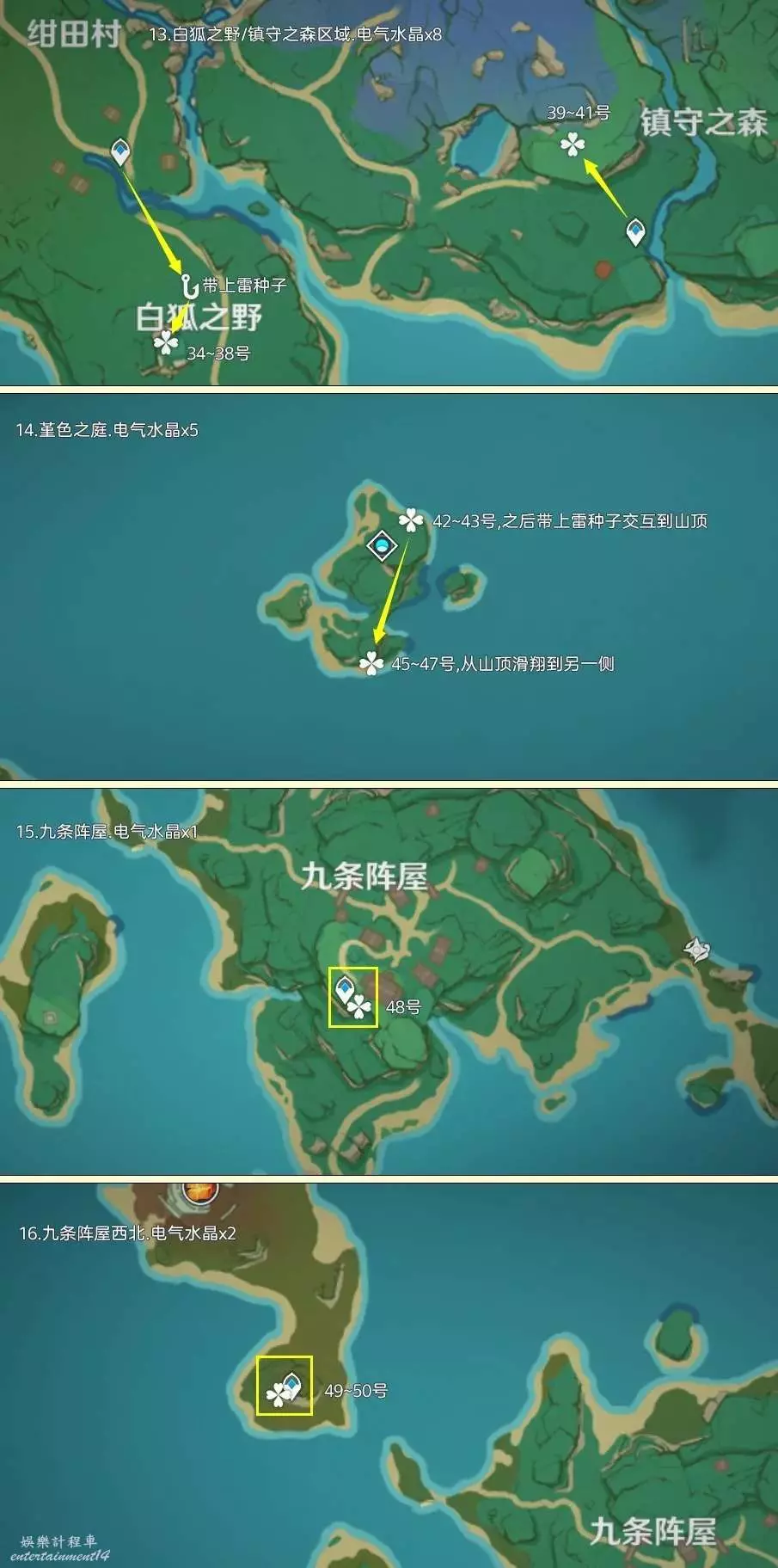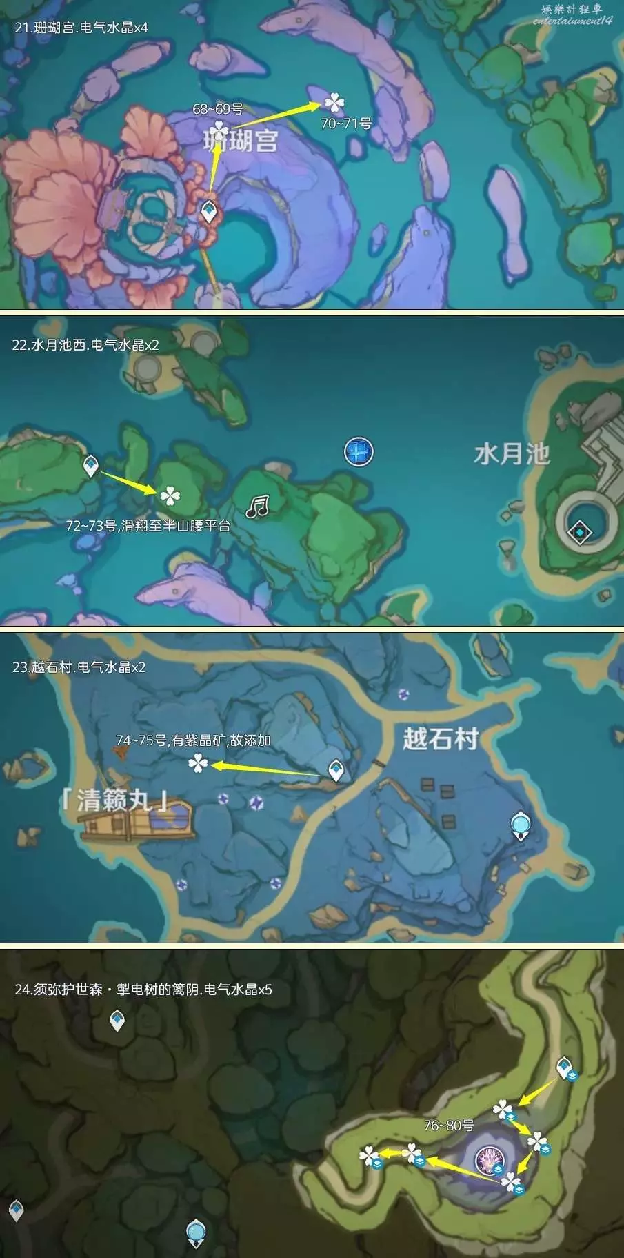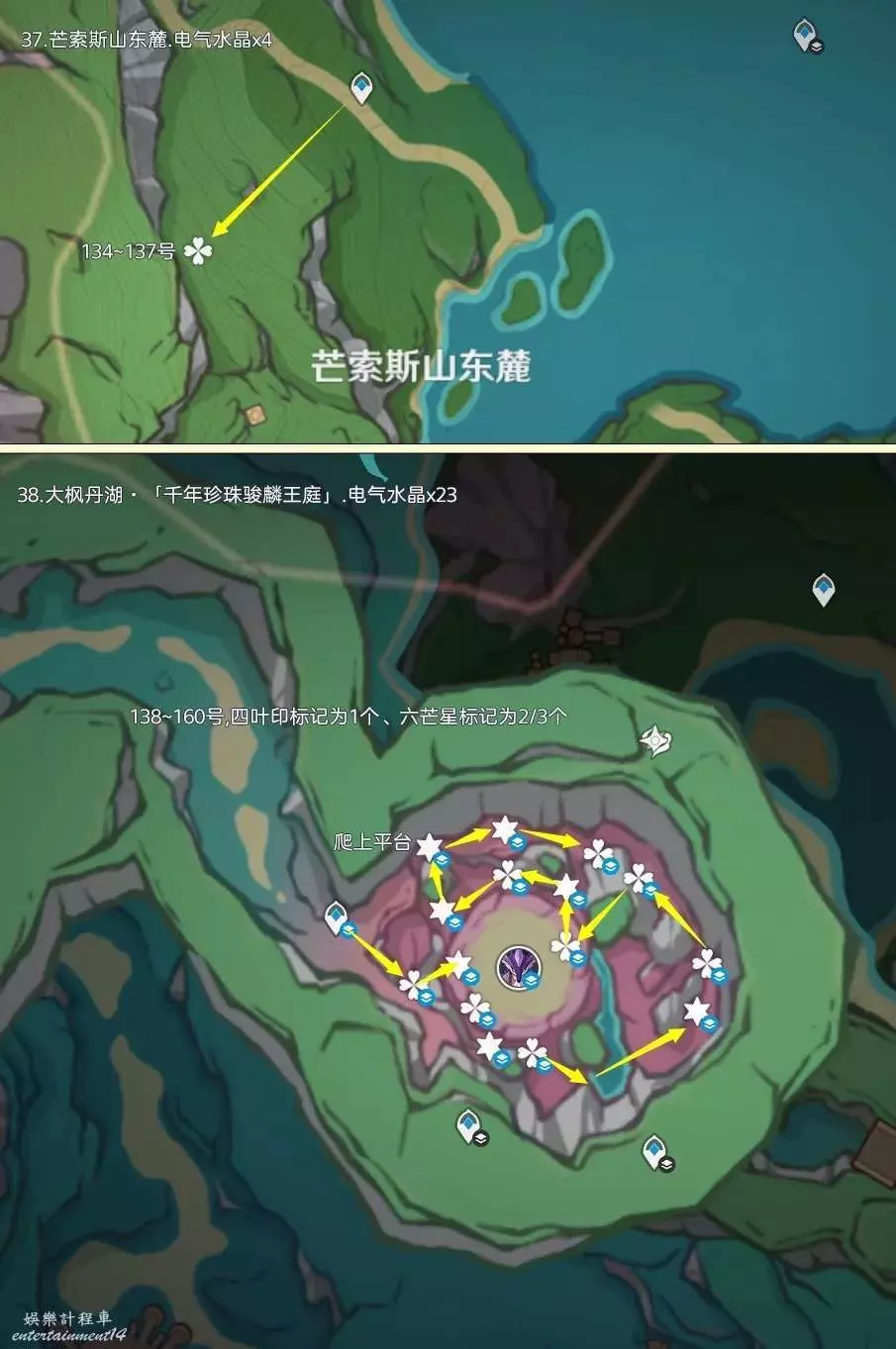 電氣水晶點位廣泛的分佈在提瓦特地區,其中可重複採集數量為160個;超高效率點位有楓丹雷麒麟boss點,有23個;製作路線時儘量遵循從上往下游,視野高好看清,方便旅行者探索。