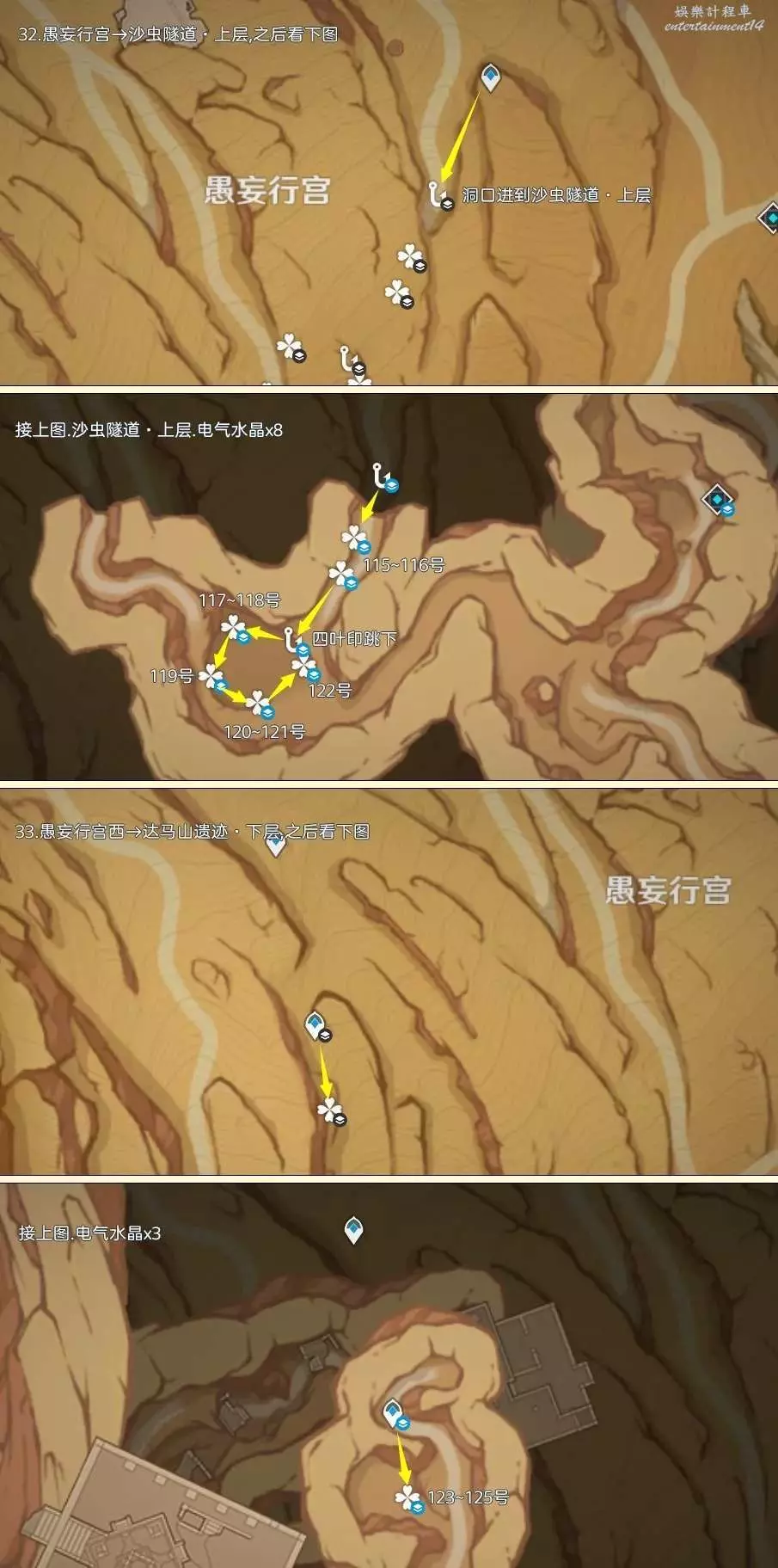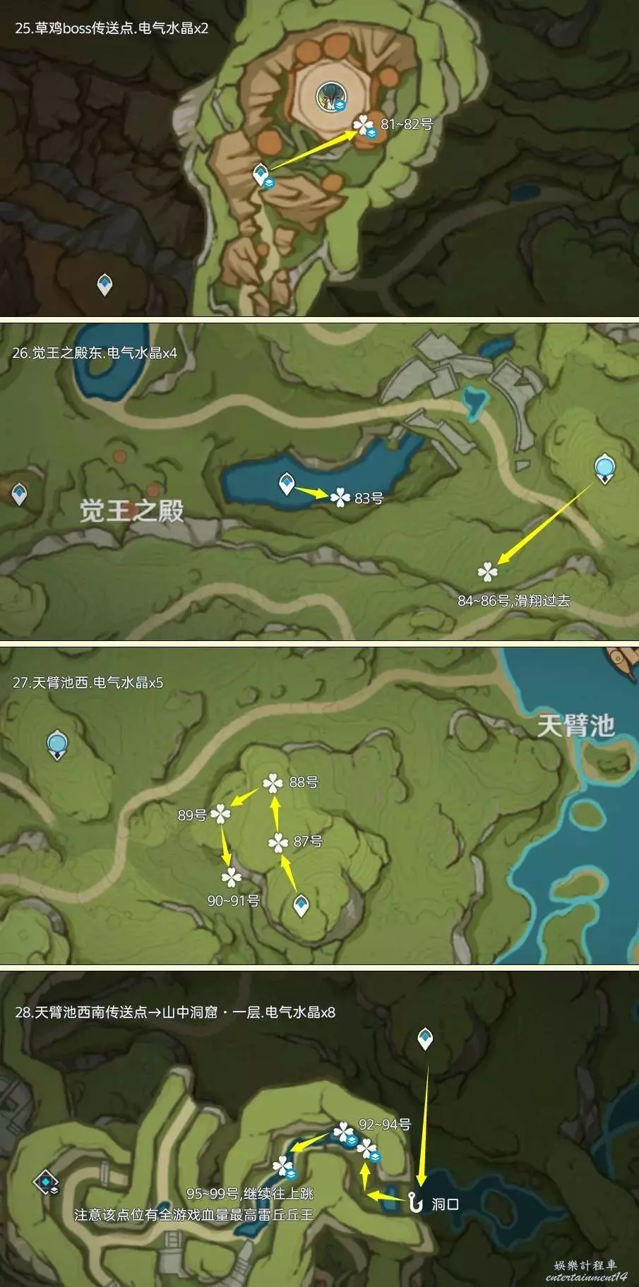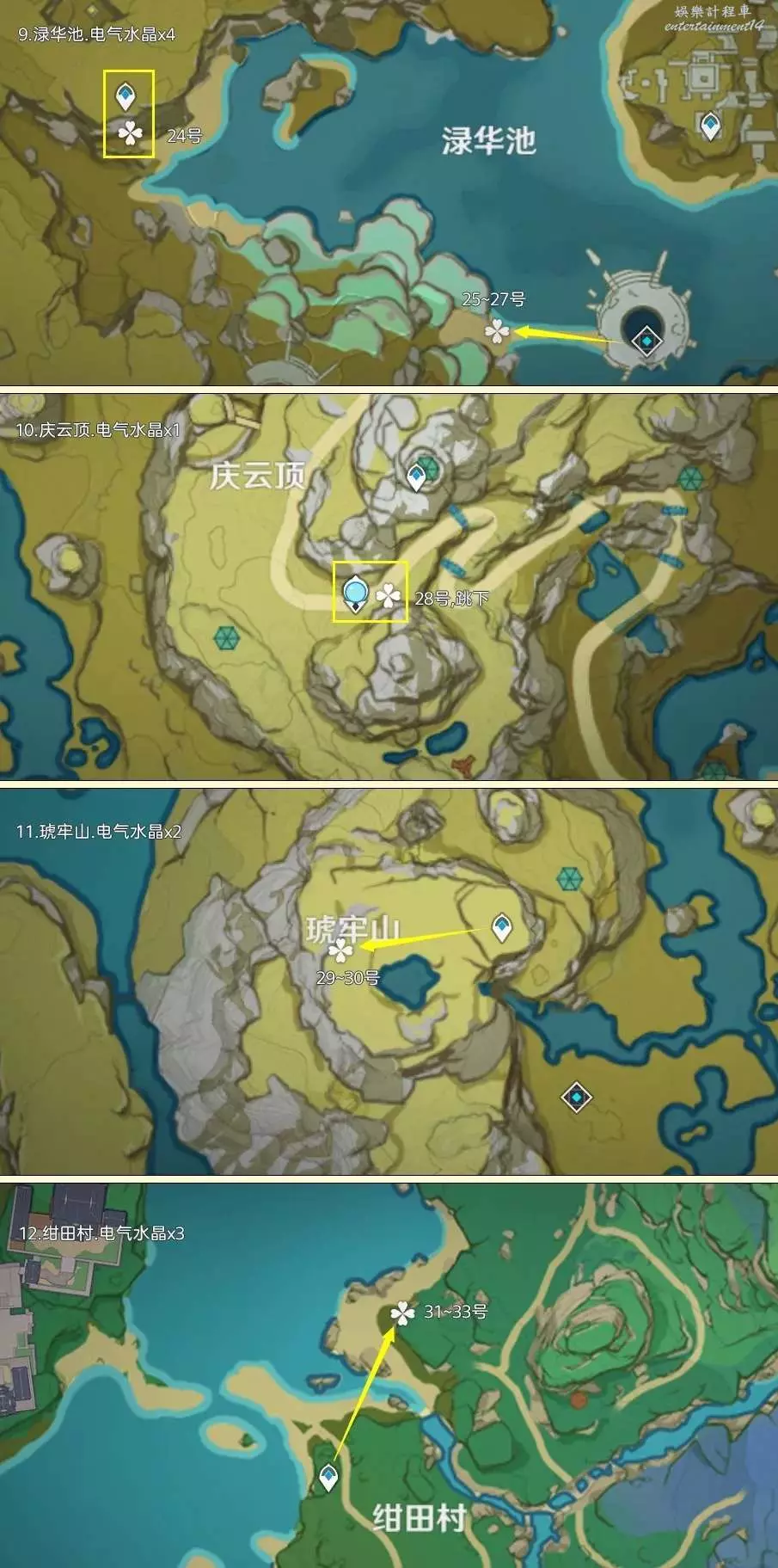 電氣水晶點位廣泛的分佈在提瓦特地區,其中可重複採集數量為160個;超高效率點位有楓丹雷麒麟boss點,有23個;製作路線時儘量遵循從上往下游,視野高好看清,方便旅行者探索。