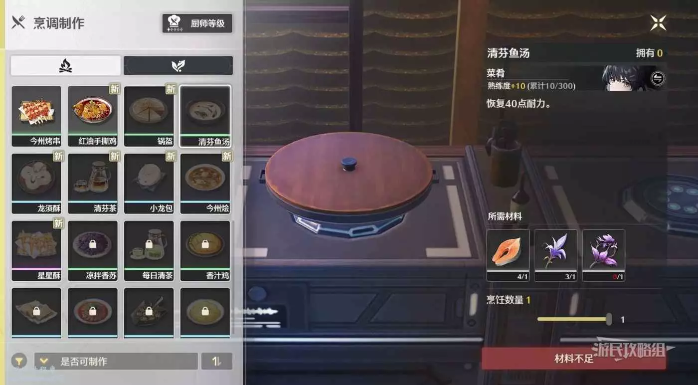 清芬魚湯需要烹飪獲得,可以在攀花飯館進行烹飪。需要消耗魚肉×1、清芬草×1、香蘇×1。