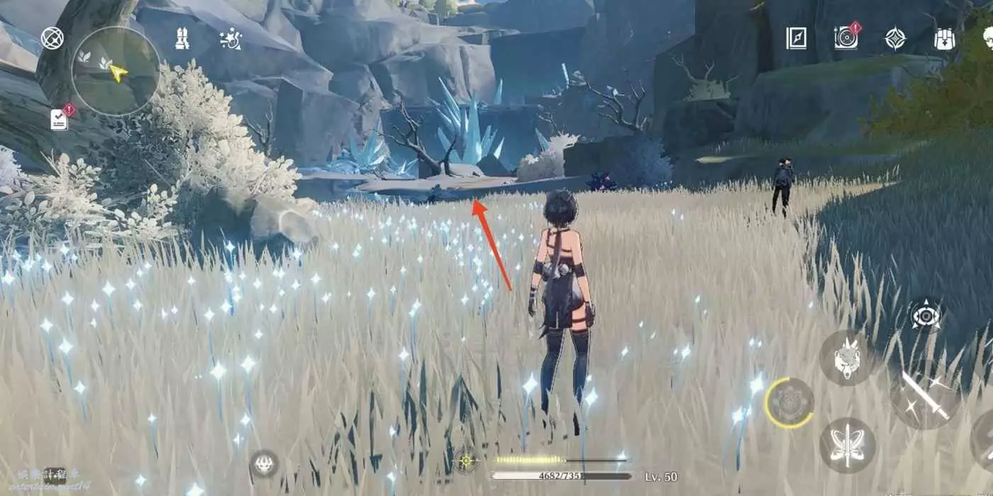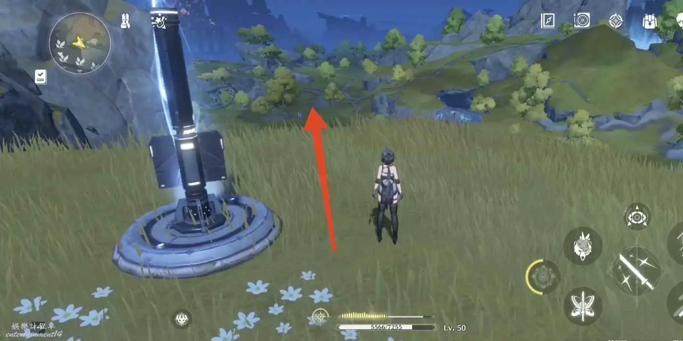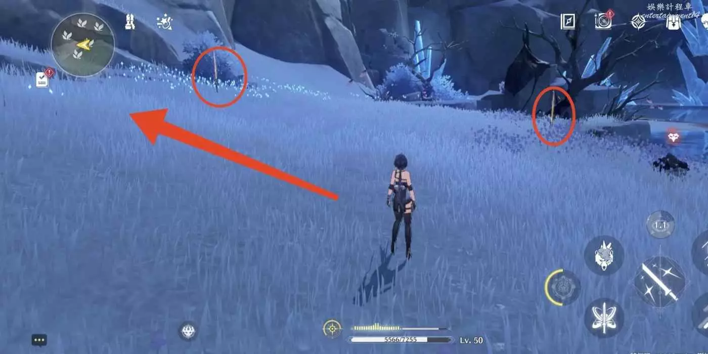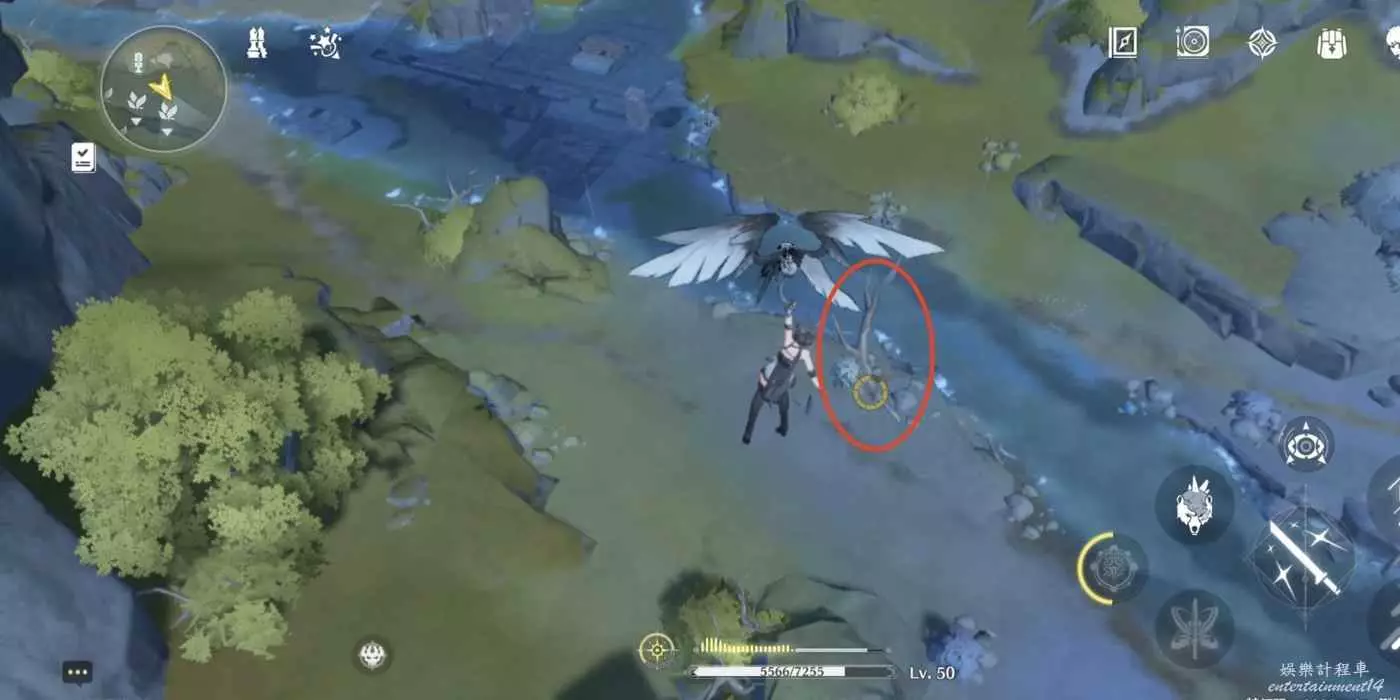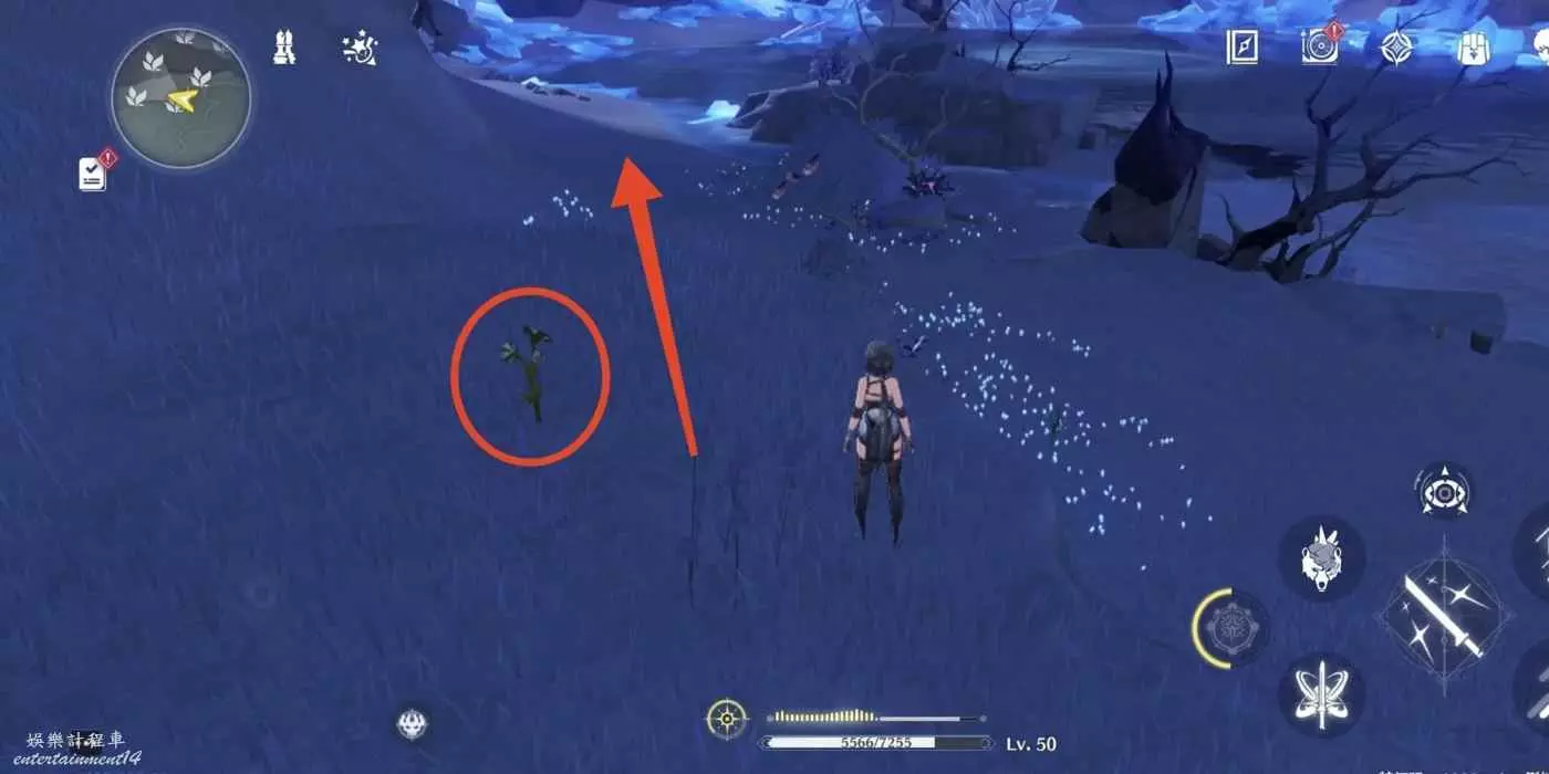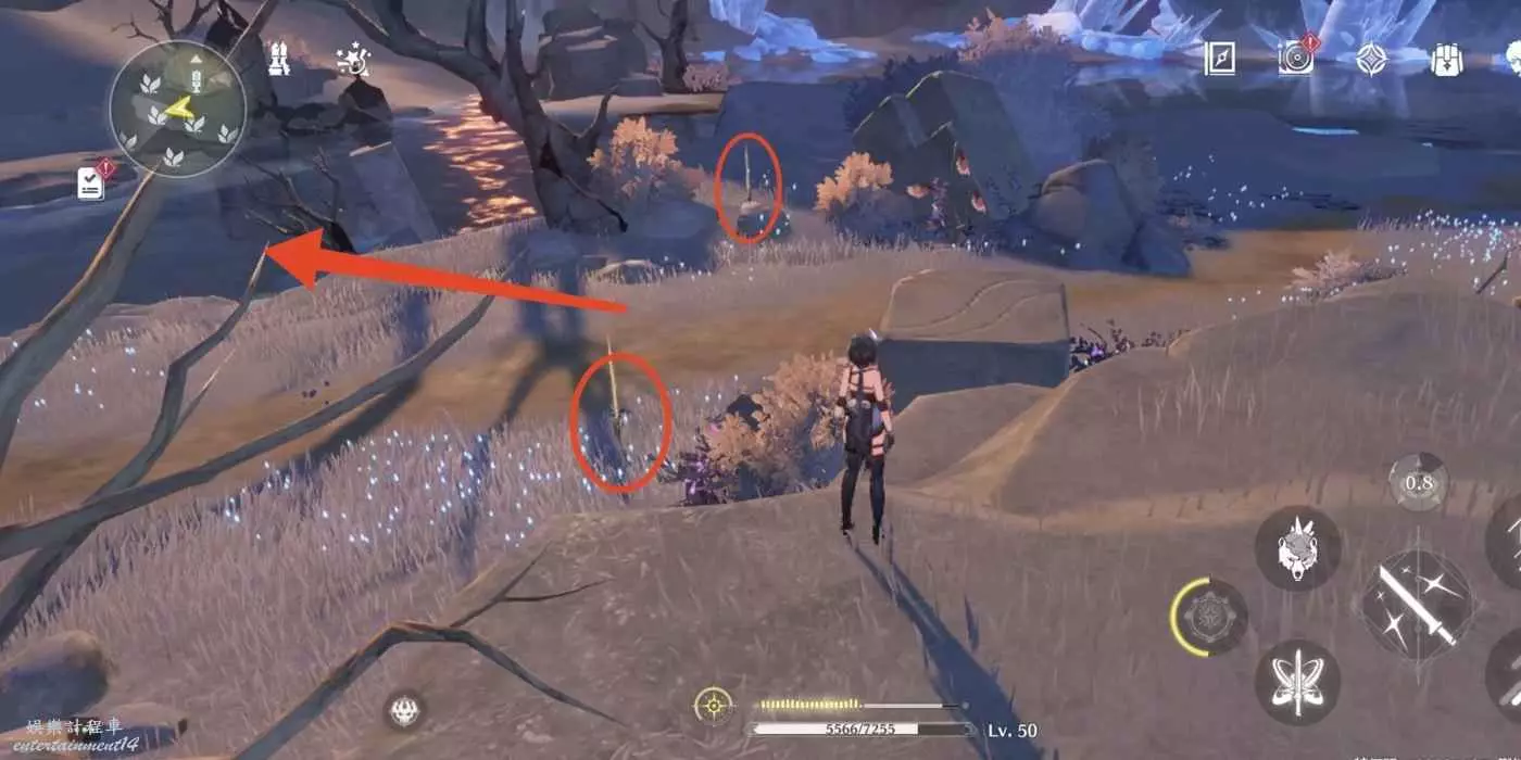 到枯樹旁邊,把視角轉到西北方向(小地圖左上角)往前走。