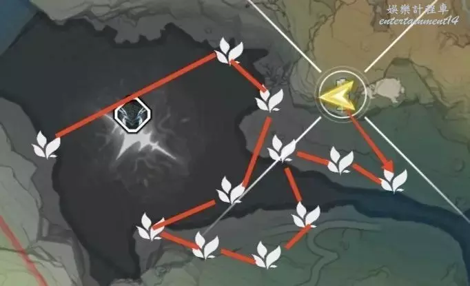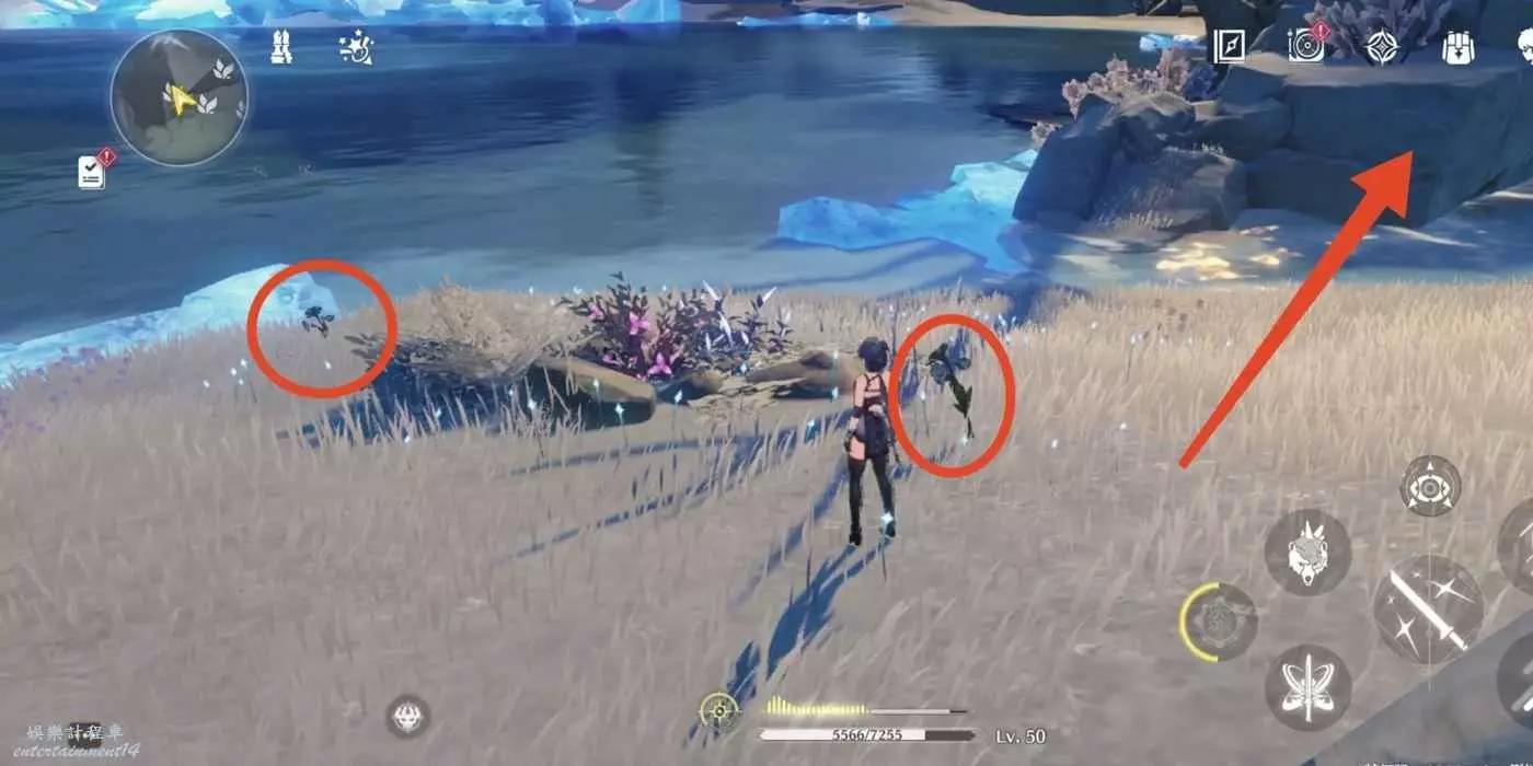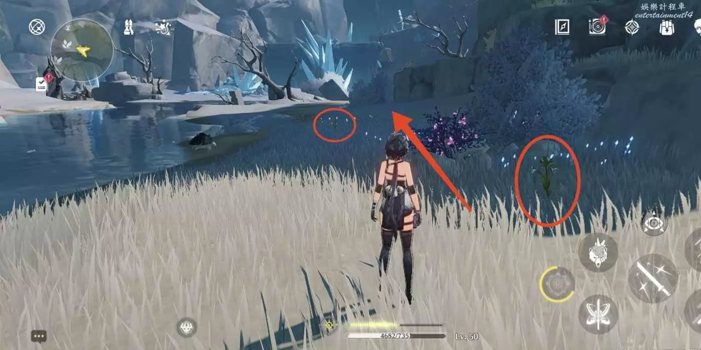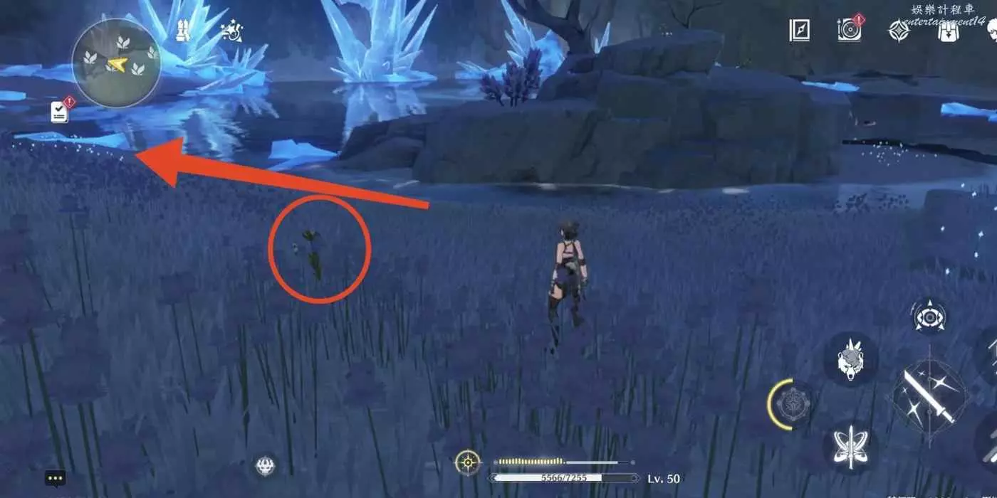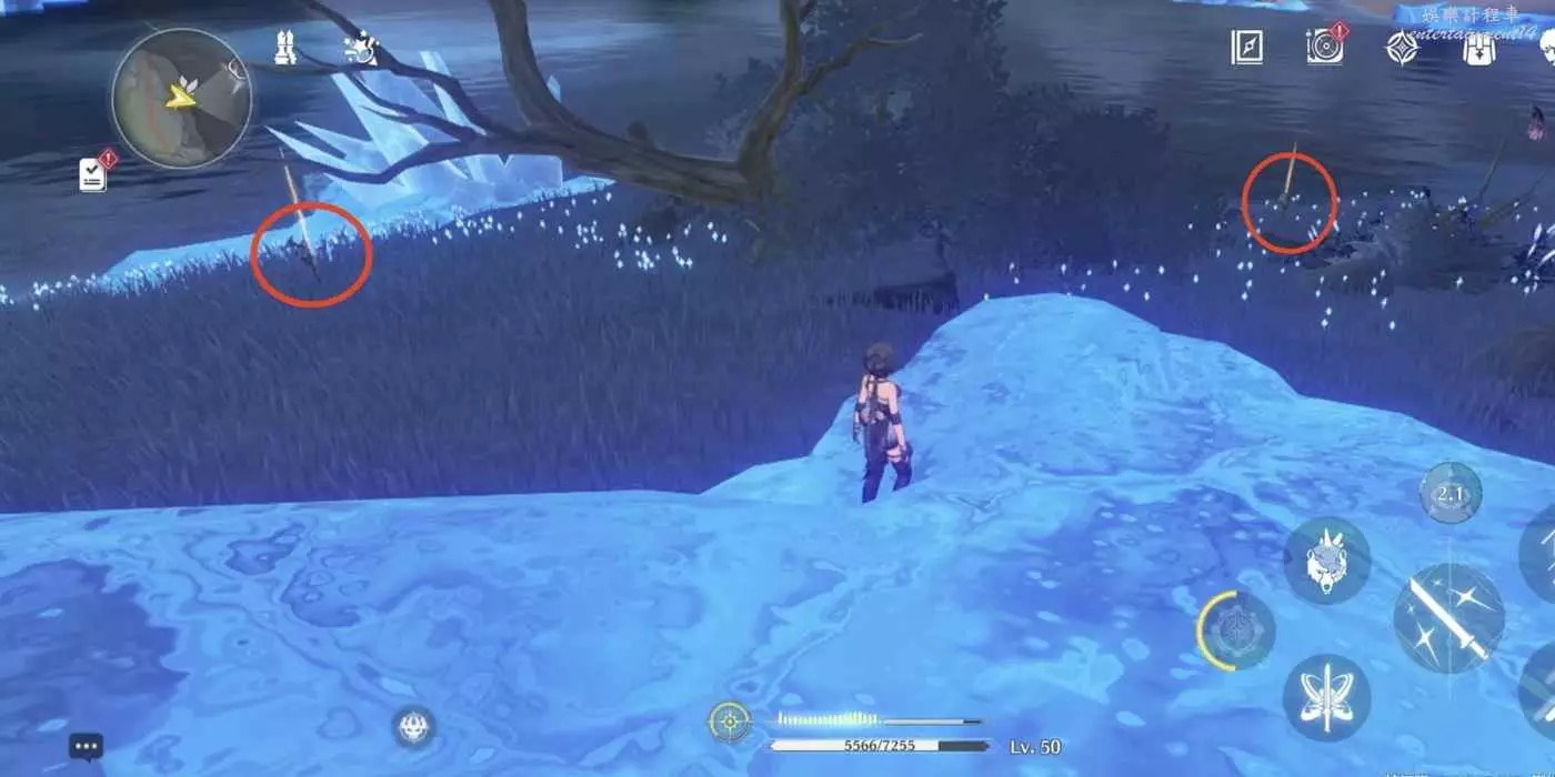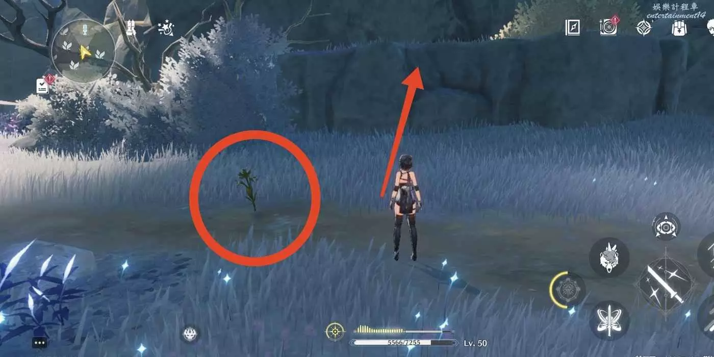 到枯樹旁邊,把視角轉到西北方向(小地圖左上角)往前走。