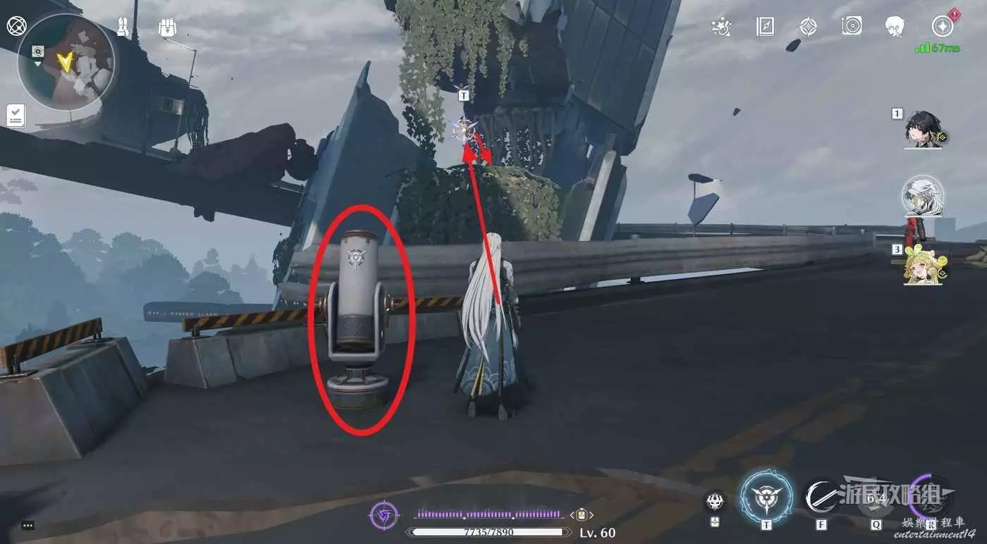 可以看到路邊有個炮筒,參考下圖紅圈位置,與炮筒互動會吐出鉤子,按T鉤住鉤子,到達前方的大樓廢墟裡。