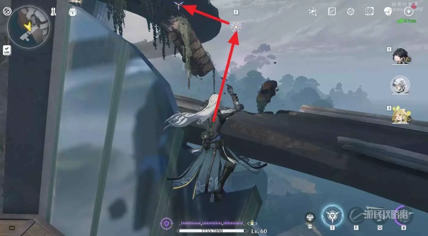 跳起後往左側轉頭可以看到空中的兩個鉤子,按T鉤住,到達上方的公路。