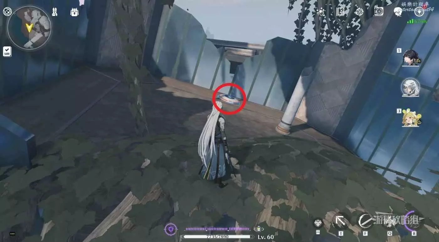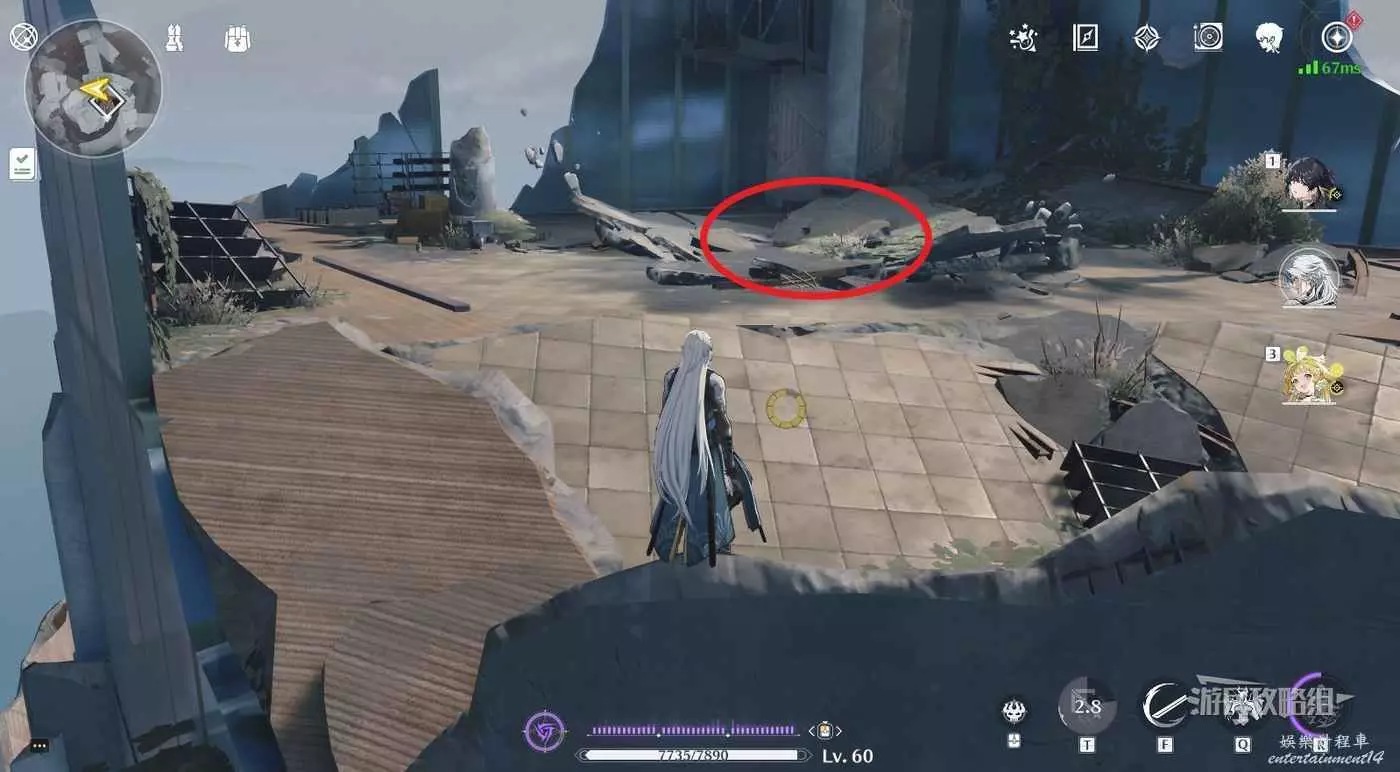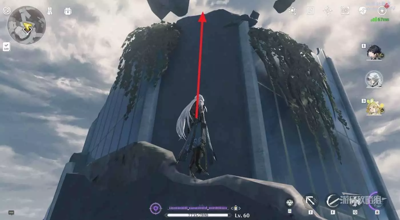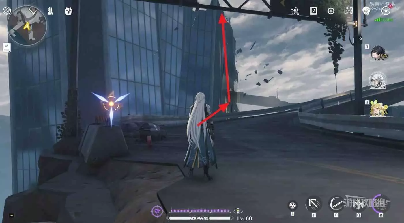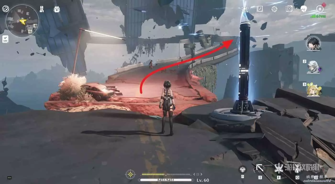 從傳送錨點出發,沿著空中漂浮的公路往前走到下圖箭頭位置。