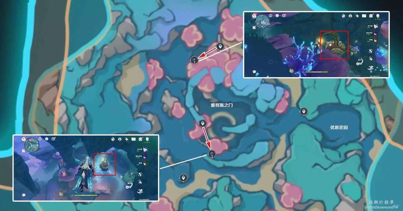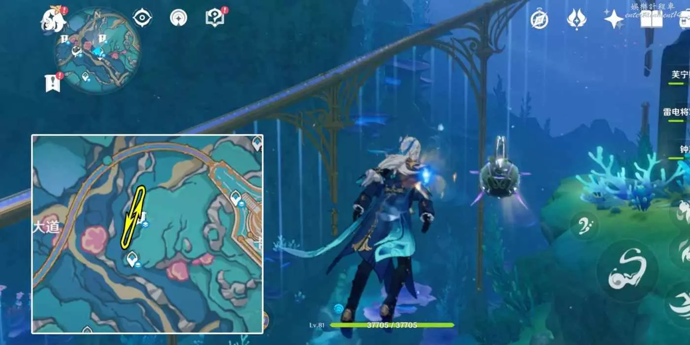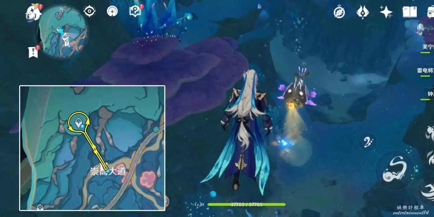 此處初始位置位於傳送點西側,黃金大鮟鱇會沿著水下小道來回移動。下圖黃線為黃金大鮟鱇移動路線(下同)