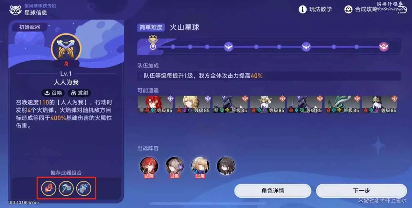 試用的三小只+阮梅(或者同諧主),主要是削韌觸發姬子被動和黑塔被動,連動之後擊殺更多小怪來提升等級;練度不夠的話 其他拉條補點的輔助都可以,比如火花、鴨鴨、知更鳥、停雲等;