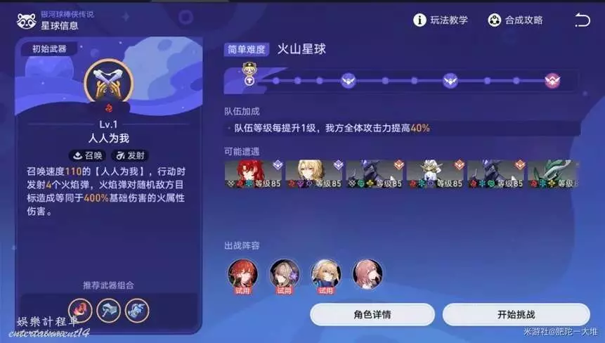 這裡給了初始武器【人人為我】,還給了三個推薦武器,武器的選擇大家可以根據敵人的屬性弱點來選,就拿本關來說火屬性弱點的敵人居多,其次是冰屬性弱點,那麼我們選擇武器的時候儘量優先選擇打火屬性傷害的武器,再次選打冰屬性傷害的武器,就我個人體驗來說本關武器選擇的優先順序為:卑劣者的善心>人人為我>寒霜滅火器。卑劣者的善心勝在全體攻擊,且擊敗的敵人越多傷害會越高。