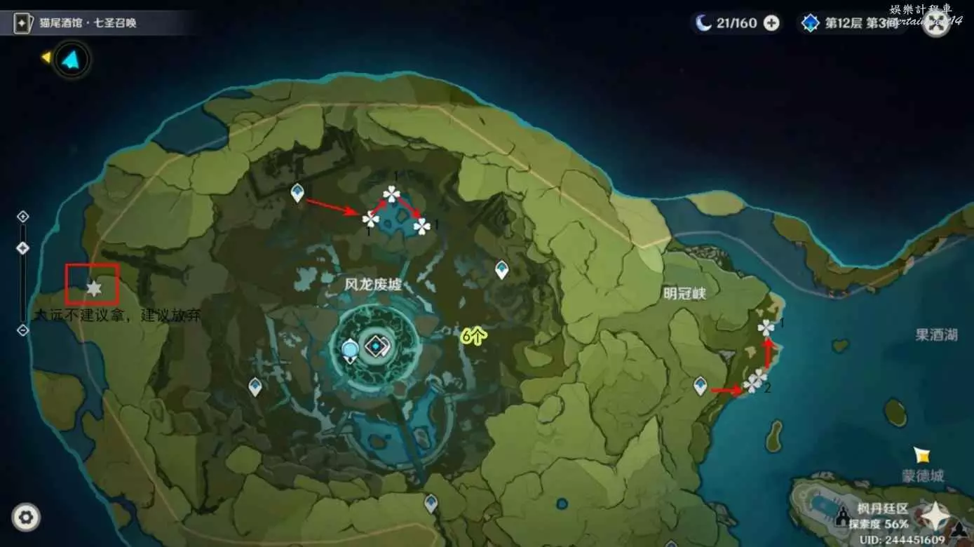 2.風龍廢墟以及明冠峽右側海岸,數量較少,但很好找,不過風龍廢墟最左側六角星標註位置,只有一個,非常遠,浪費時間,不建議去收集,這個時間留出來可以收集其他區域了,而且一個,去商人買,去塵歌壺種都比這個有性價比。