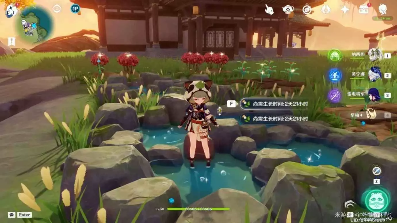 收集嘟嘟蓮時,隊伍裡可攜帶草神,米卡/可莉,另外兩個位置可攜帶雙風,啟動迅捷之風提高跑圖效率,雙風角色可用早柚、閑雲、散兵等,跑圖更舒適。