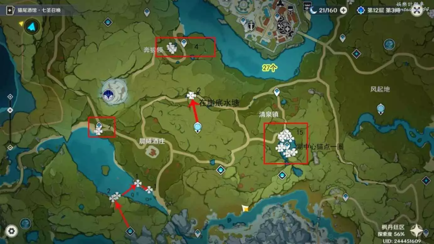3.這張線路圖可收集的嘟嘟蓮數量非常龐大,共計能拿到27個,僅清泉鎮湖中心錨點四周就存在十幾個,這條路線性價比超級高。