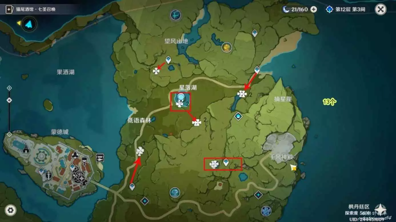 1.蒙德城右側區域比較豐富,每個水域基本都有嘟嘟蓮,這邊可以收集13個,數量比較適中。