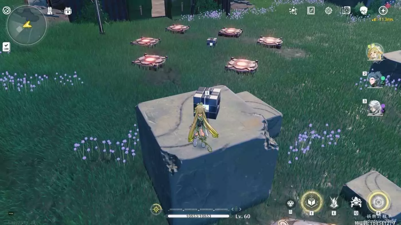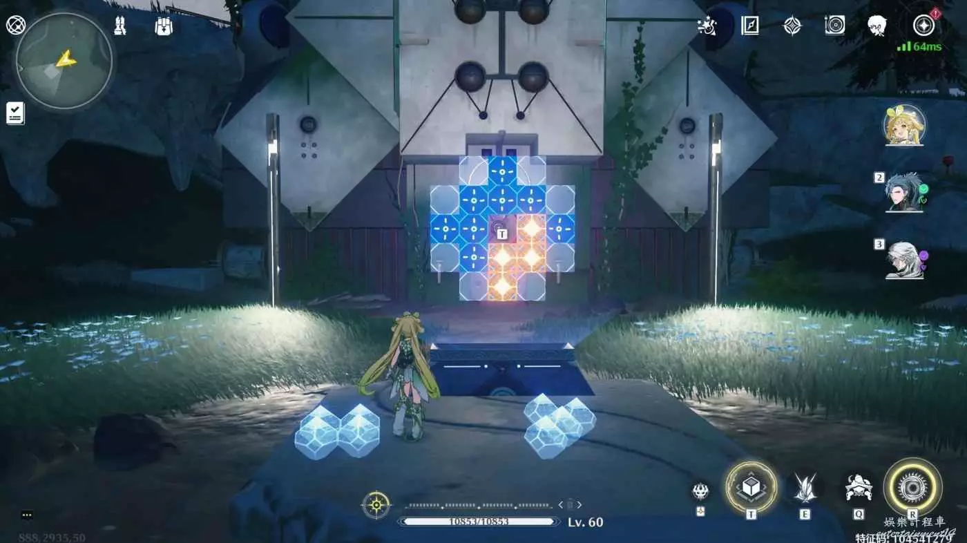 我們可以看到面前會亮兩個藍燈(本人已經做過了這裡就沒有亮),我們要根據這個藍燈的位置踩前面的踏板(一個放箱子然後自己再踩上去),然後這個石頭上的箱子會被解鎖