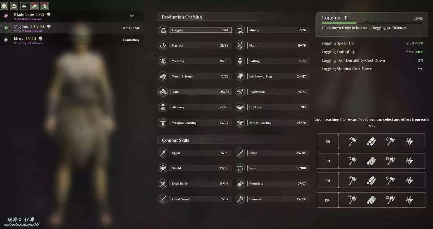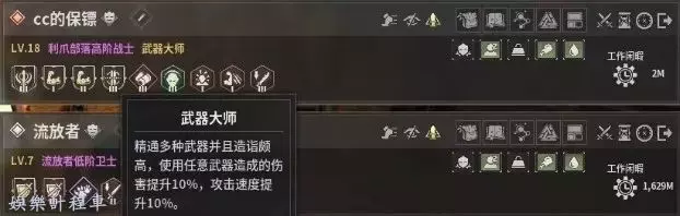 隨後在螢幕右側就可以看到該族人各種資訊,包括技能的熟練度上限和他所領悟的武器專精。為族人分配合適的工作往往會事倍功半,在遊戲前期,我們應該關注族人當前的熟練度等級而非熟練度上限,這樣可以確保族人的工作效率。當然,在遊戲中期或者後期,技能熟練度上限高的族人更有優勢。有些族人有更高的武器熟練度上限,這樣的族人適合作為戰鬥隨從,這個我們後面再講。