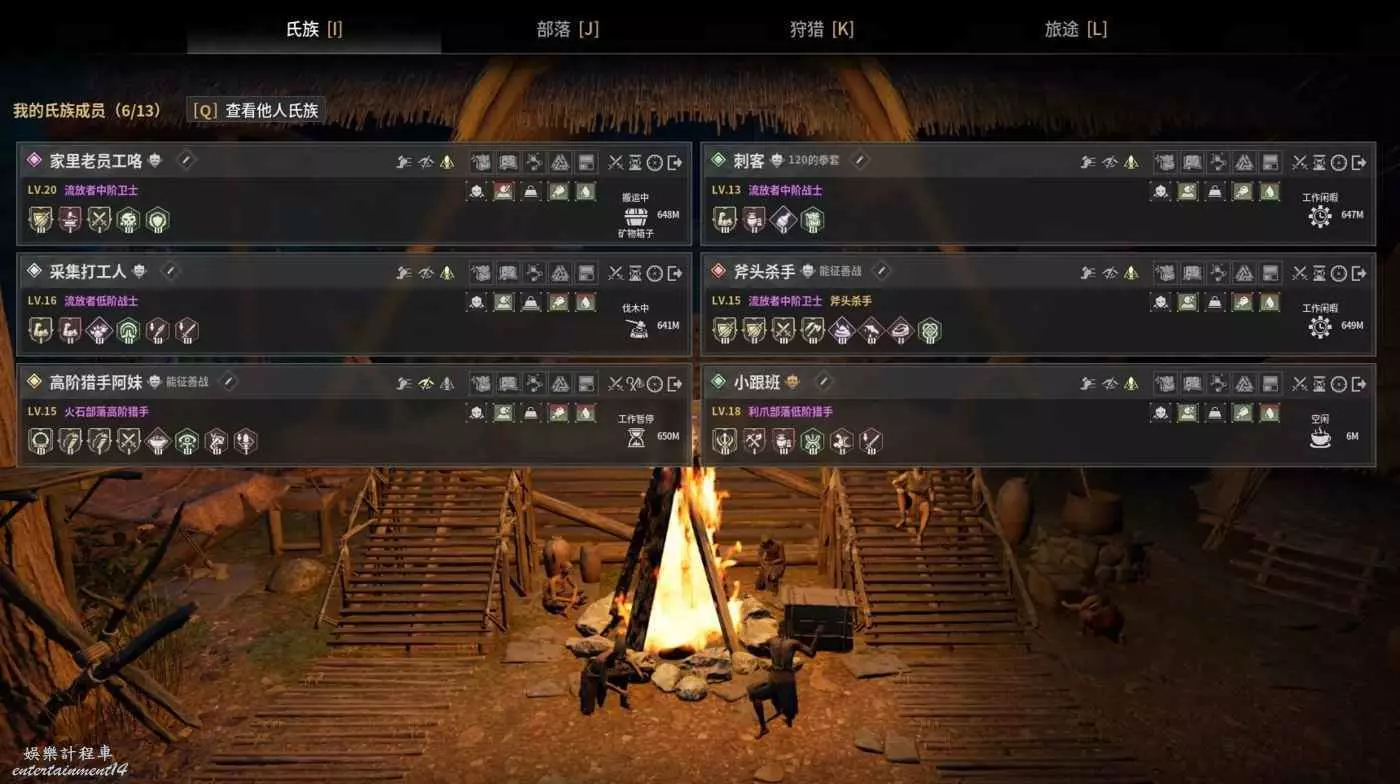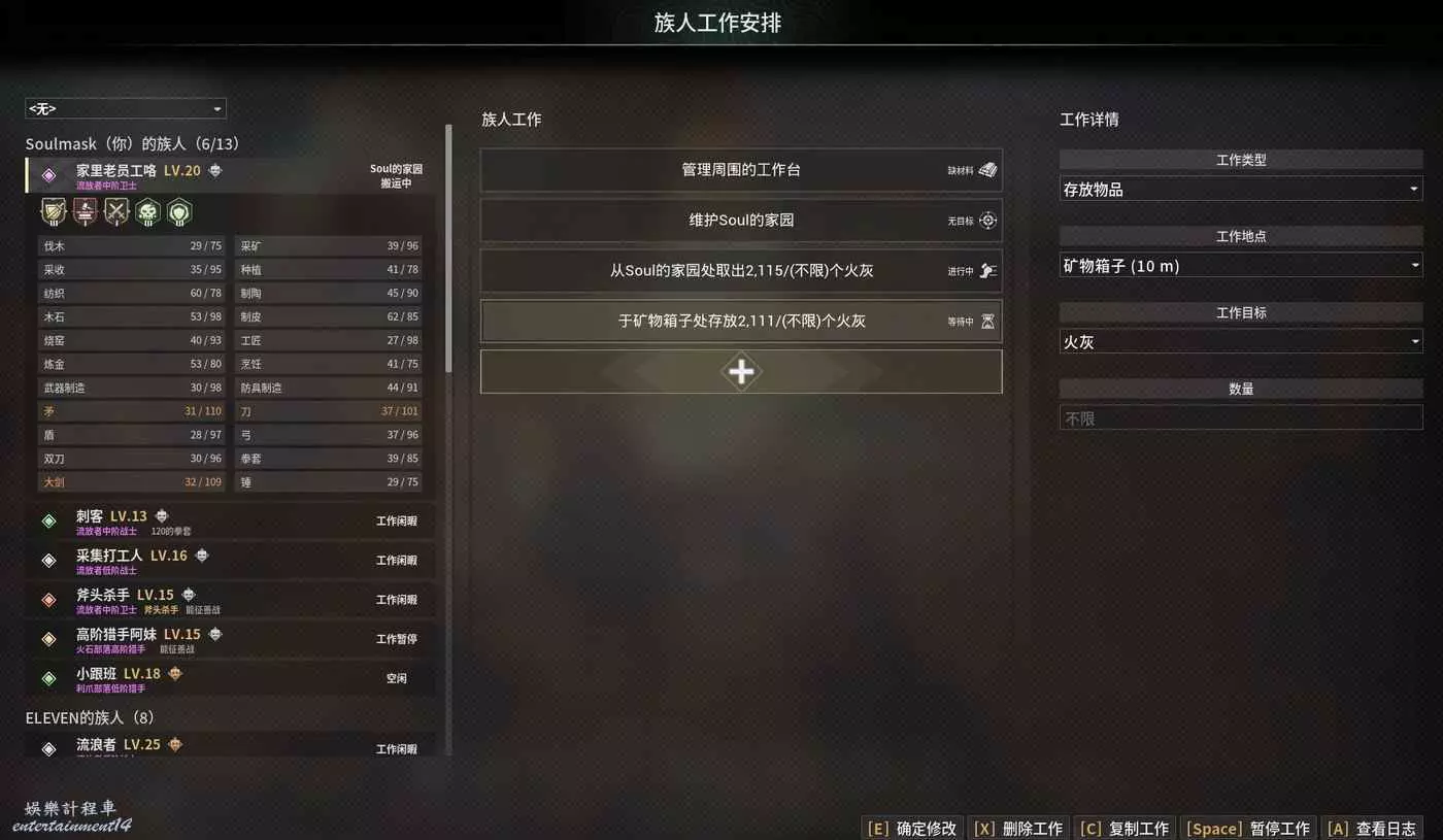 在後期,您的族人多了以後,也可以通過對營火長按【E】,來同步安排多個族人的工作