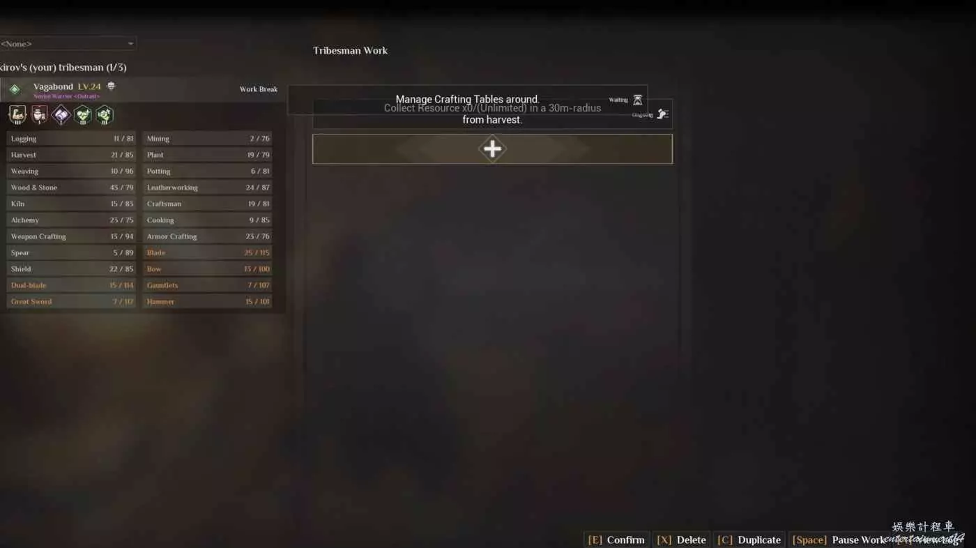 隨後按【E】鍵確認工作,再用滑鼠點擊任務條,按【空格】鍵即可讓族人開始工作,如果該族人沒有開始工作,可以檢查該族人是否缺少對應的工具(伐木需要斧頭,採收需要鐮刀,採礦需要鎬),或者看看工作地點是不是太遠了。如果要更改任務,請按【E】鍵確認完成設置。