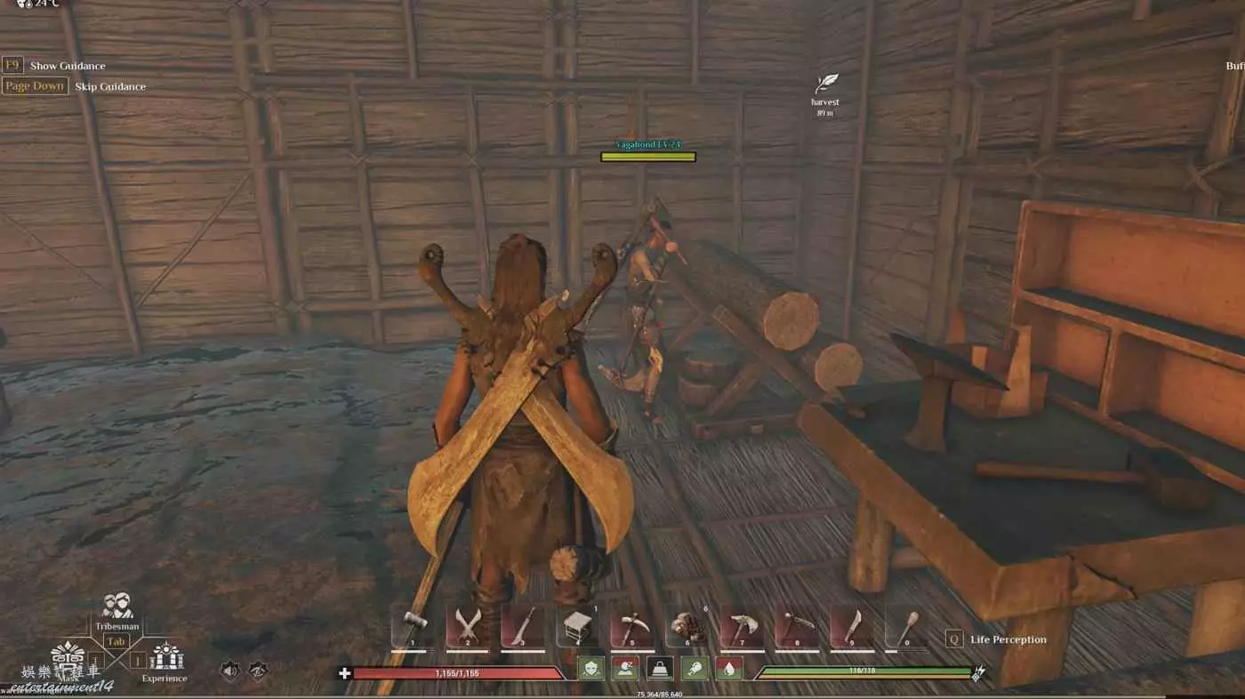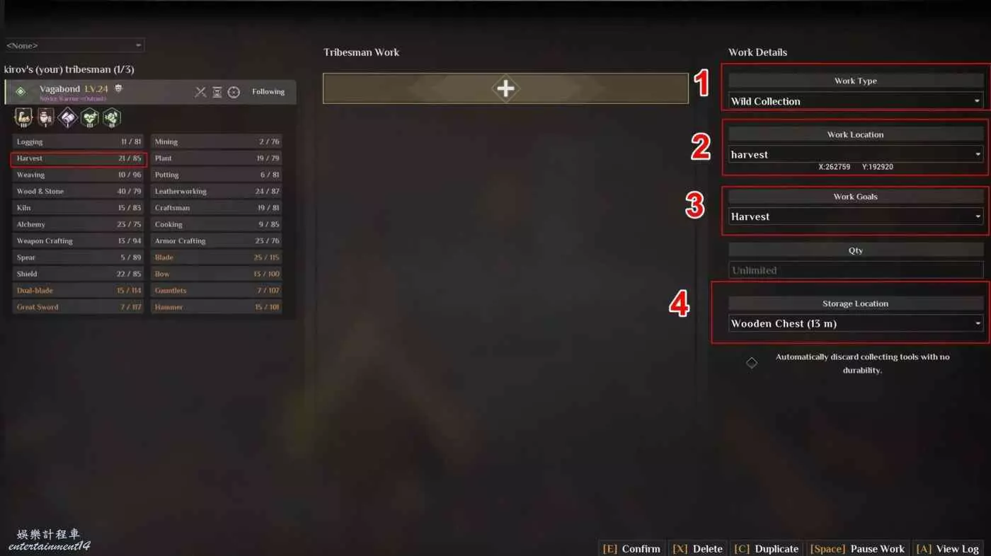 如果只是安排族人進行採收的工作,那麼你需要先給他一個對應的工具:對族人短按【E】鍵,打開他的背包,將鐮刀(可以採集灌木叢等),放進他的背包中。當然您也可以把工具放置在箱子中,族人會自行拿取。